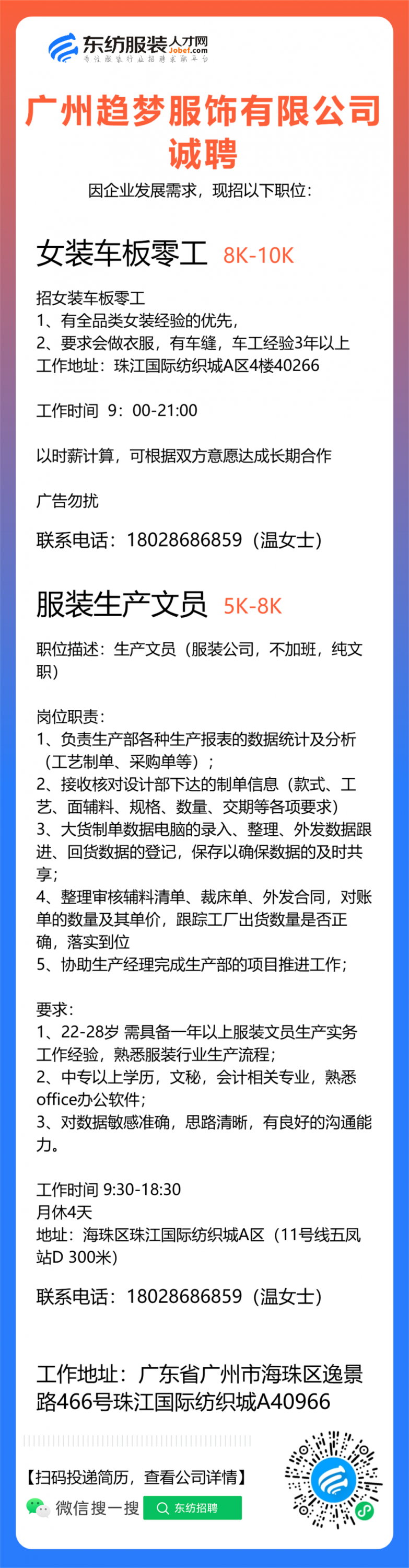 广州趋梦服饰有限公司职位:档口小妹/档口销售/档口穿版小妹/试衣模特/导购/营业员/销售助理/销售/业务员/店长助理/平面模特/营业员/销售员//面料检验/验布员/车版师/样衣工/车版衣/生产助理/文员/跟单文员/开单文员