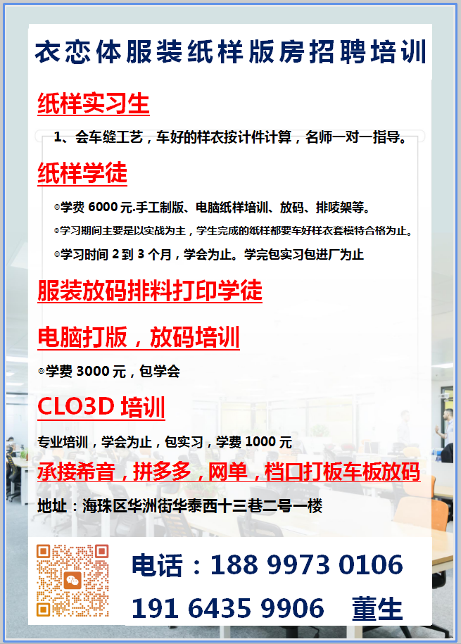 衣恋体服装纸样版房招聘培训职位:纸样师/打版师/打版兼车版/车版师/样衣工/版房助理/纸样助理/学徒/唛架师/放码员/培训/打版培训/纸样培训