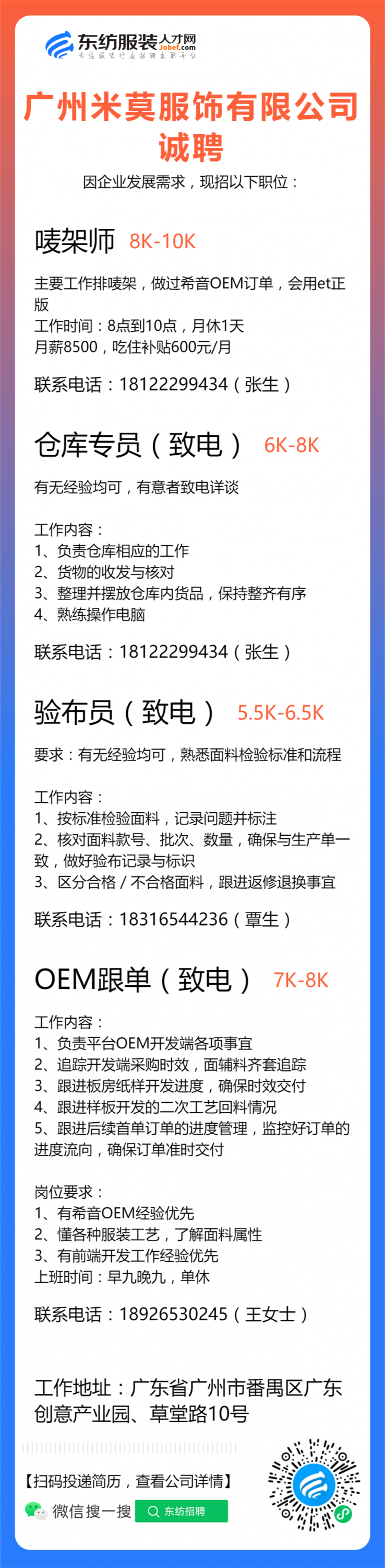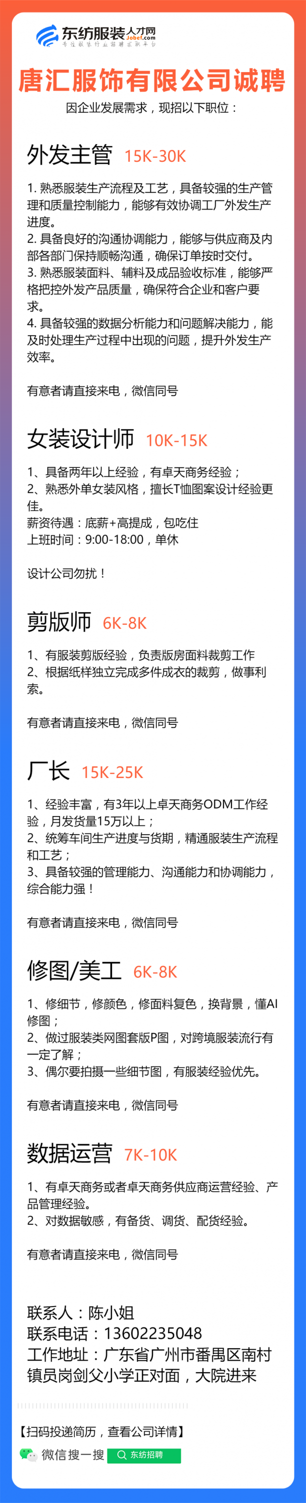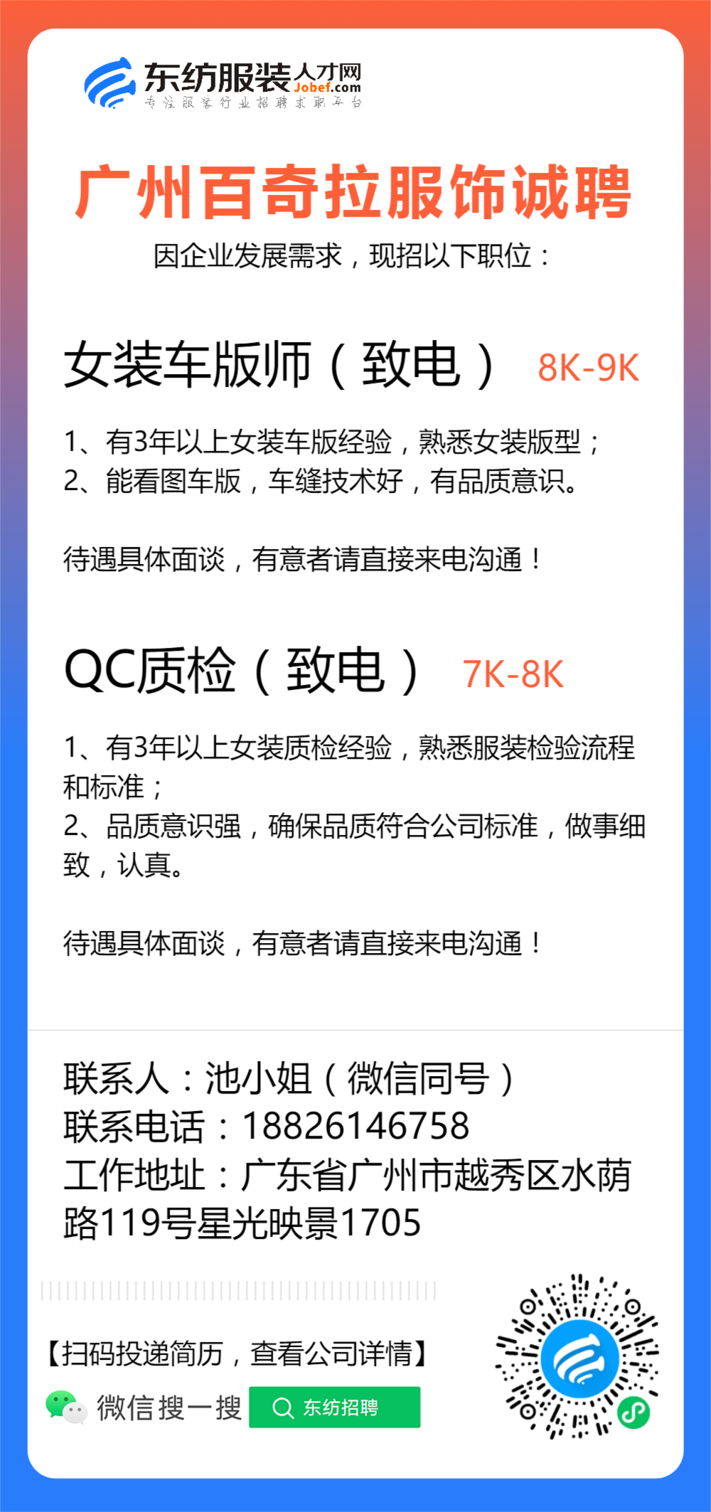 注:应聘或发邮件联系时,请注明该招聘信息来源于 东纺服装人才网www.jobef.com 谢谢!