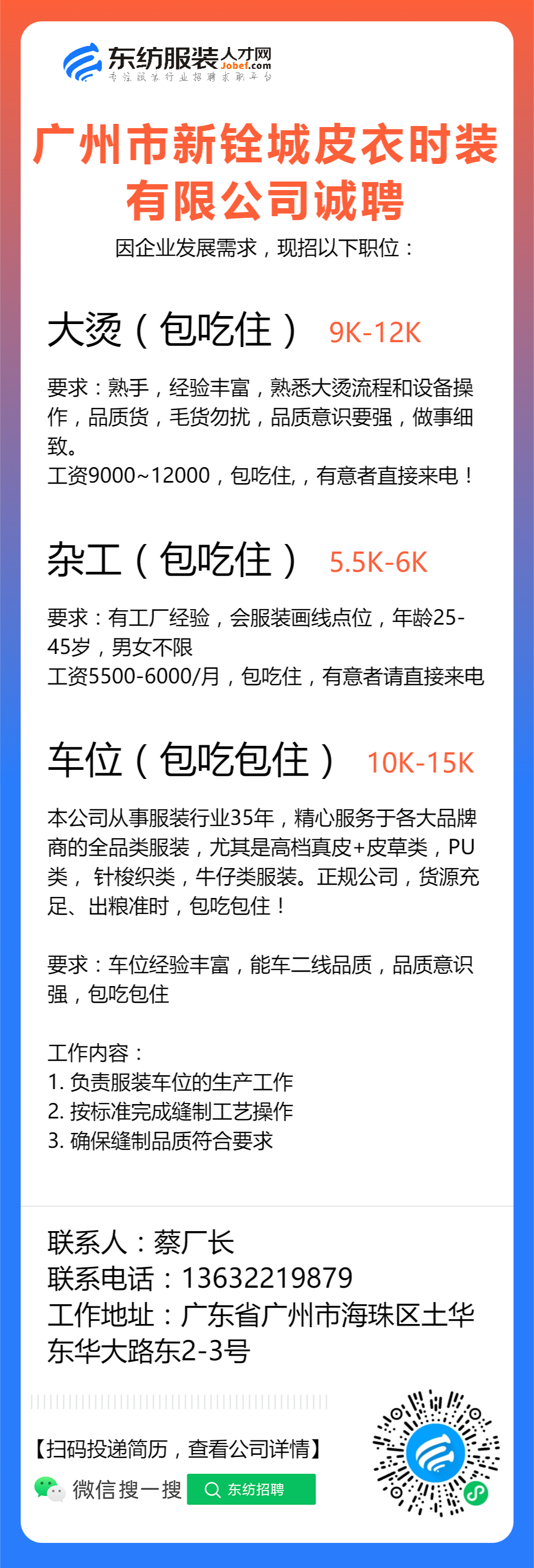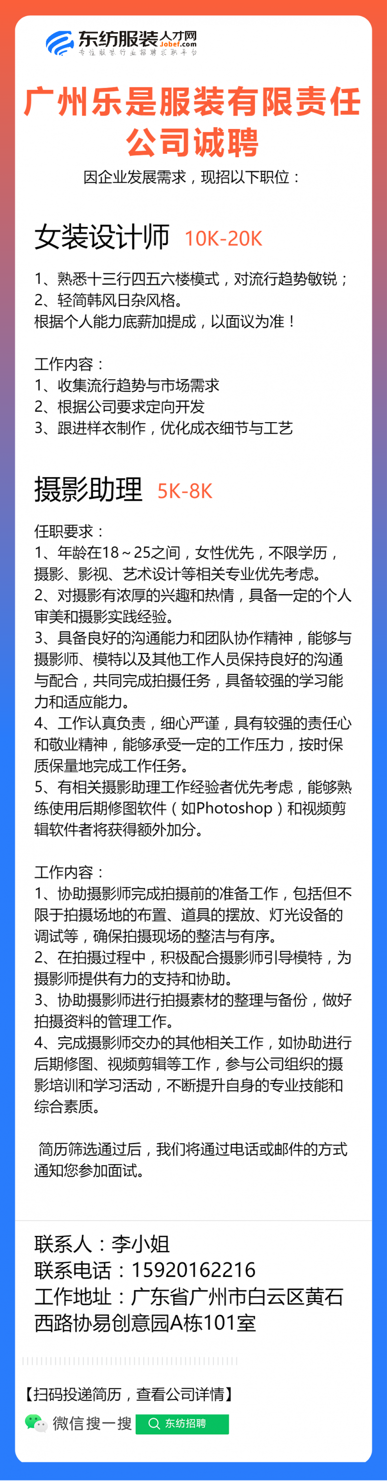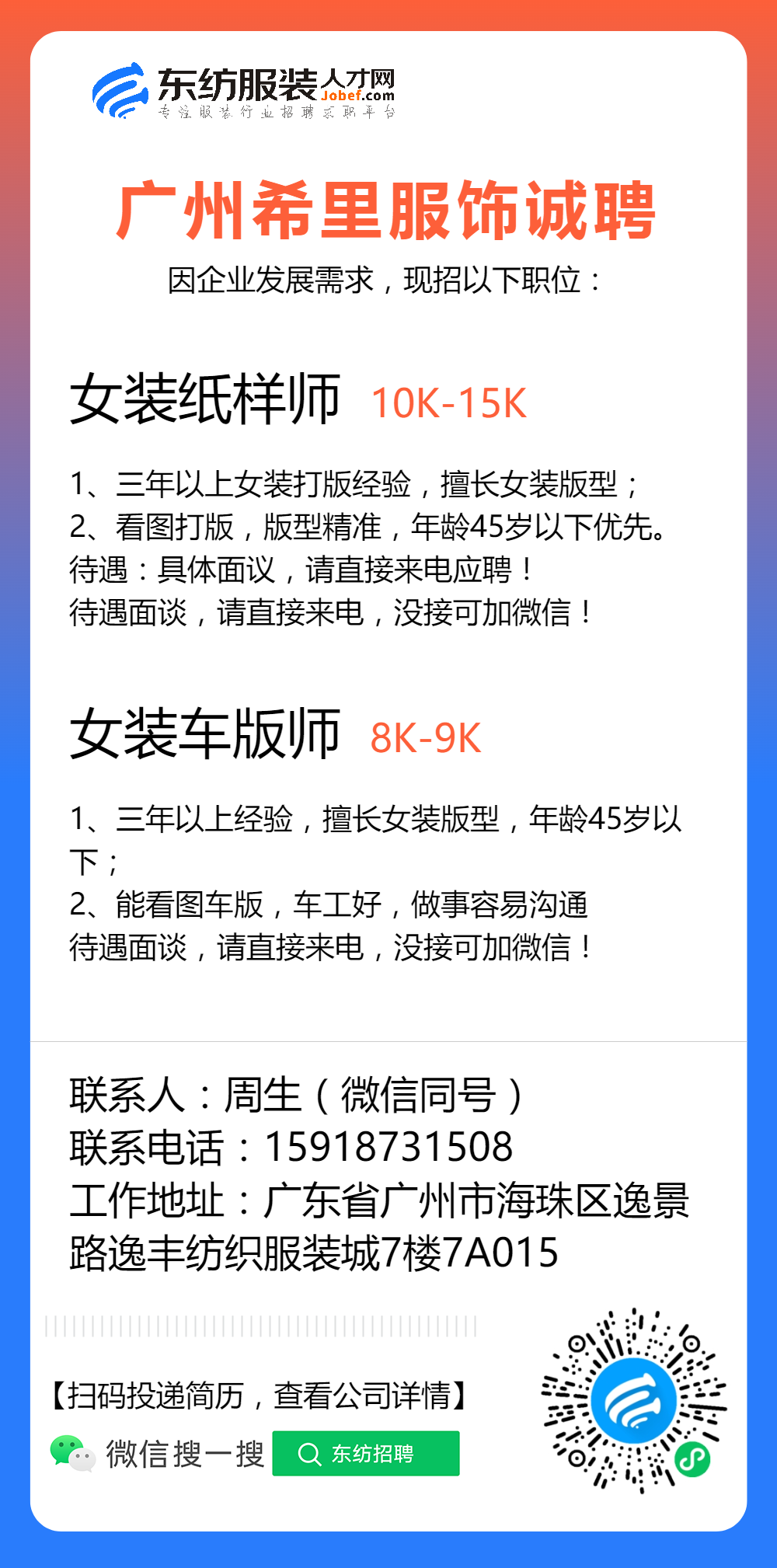 注:应聘或发邮件联系时,请注明该招聘信息来源于 东纺服装人才网www.jobef.com 谢谢!