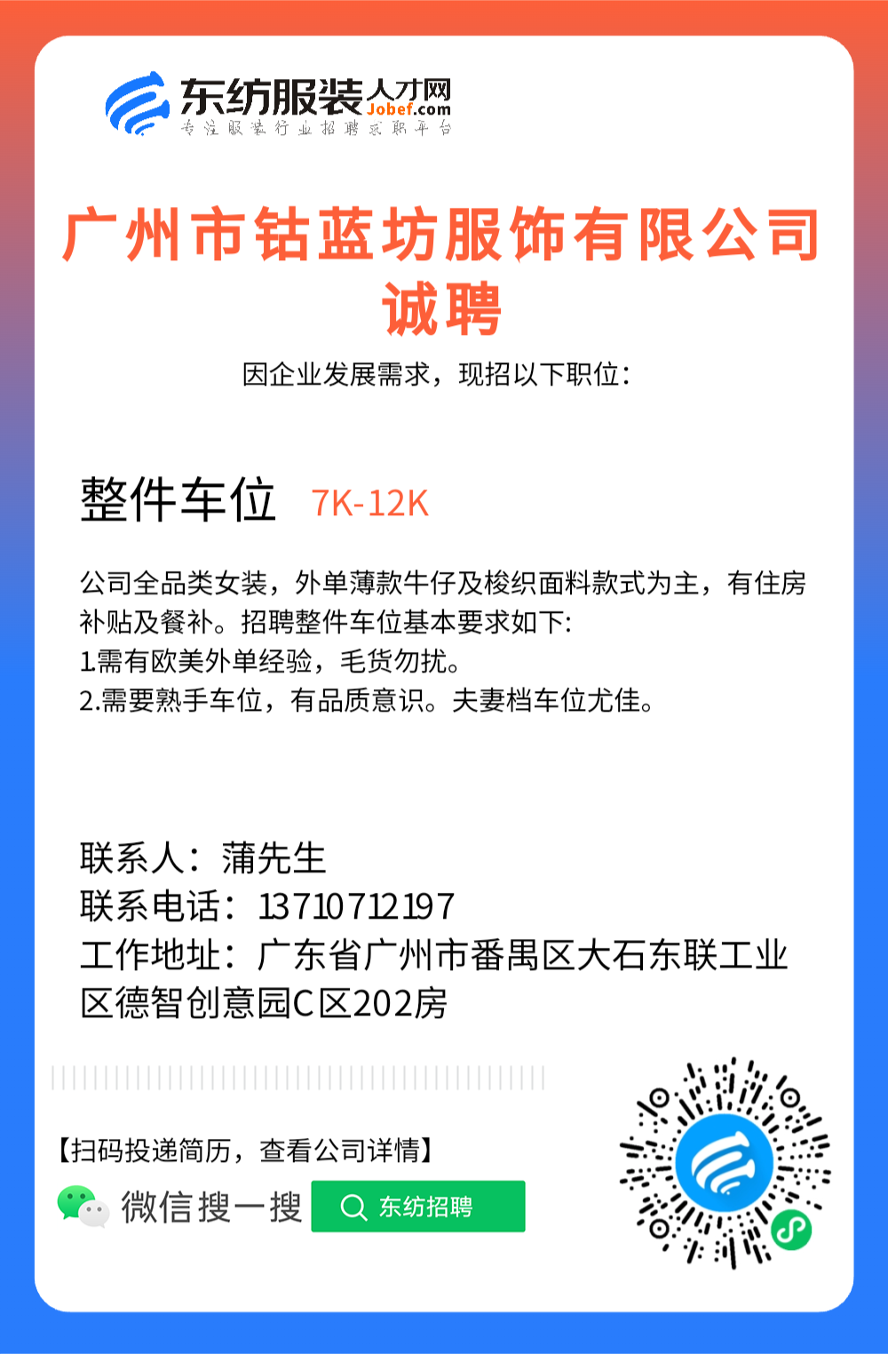 广州市钴蓝坊服饰有限公司职位:车版师/样衣工/打版师/车位/车工/普工/四车/平车/四线//五线/毛边/整件