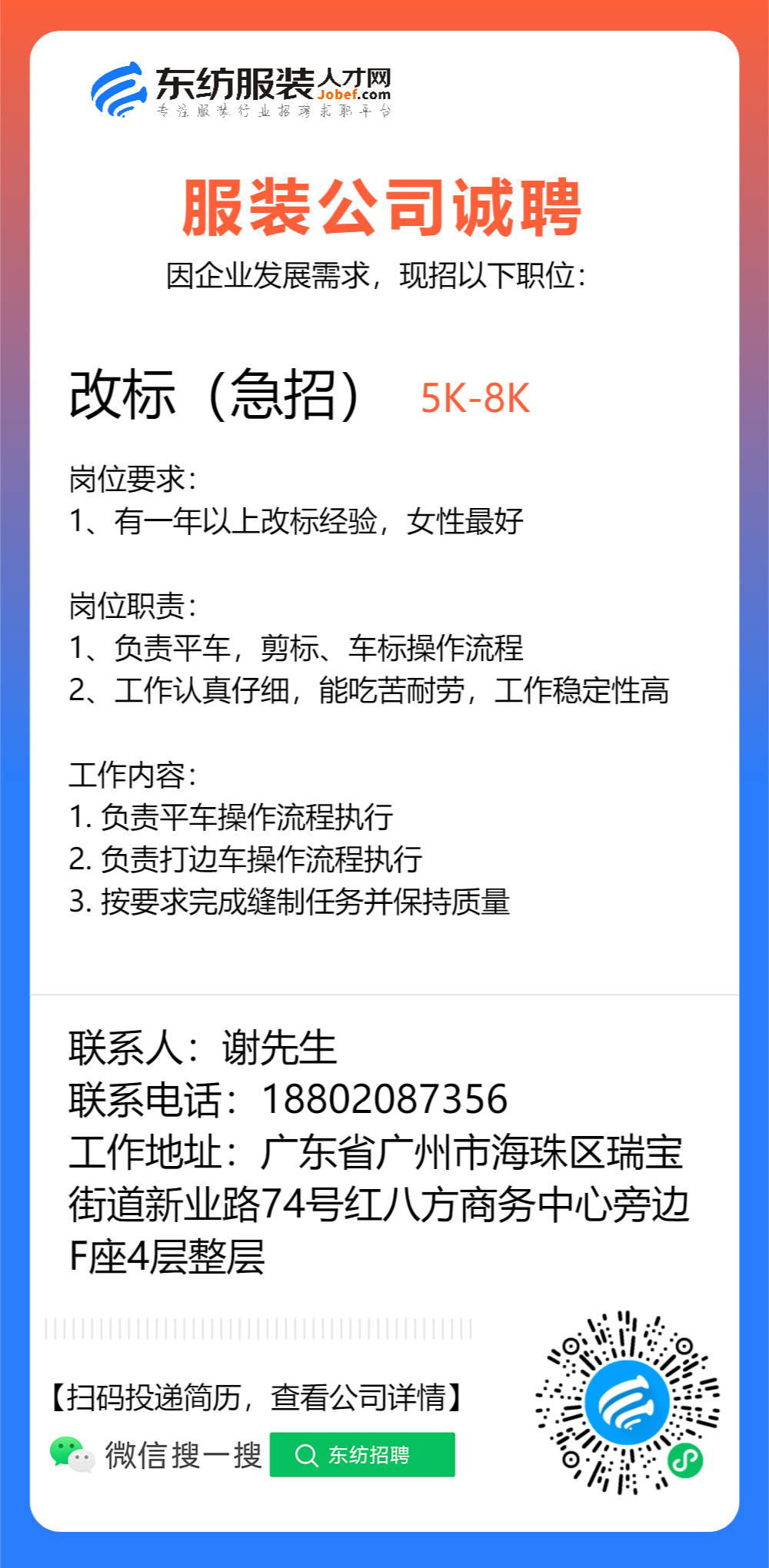 •  联系时,请一定说明在东纺服装人才网看到的,谢谢!见面最安全,发现问题请举报。