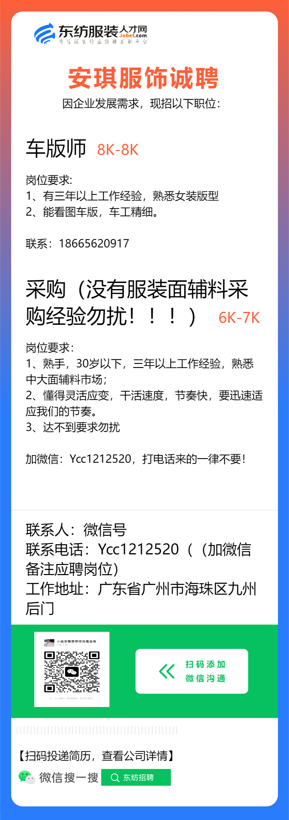 •  联系时,请一定说明在东纺服装人才网看到的,谢谢!见面最安全,发现问题请举报。