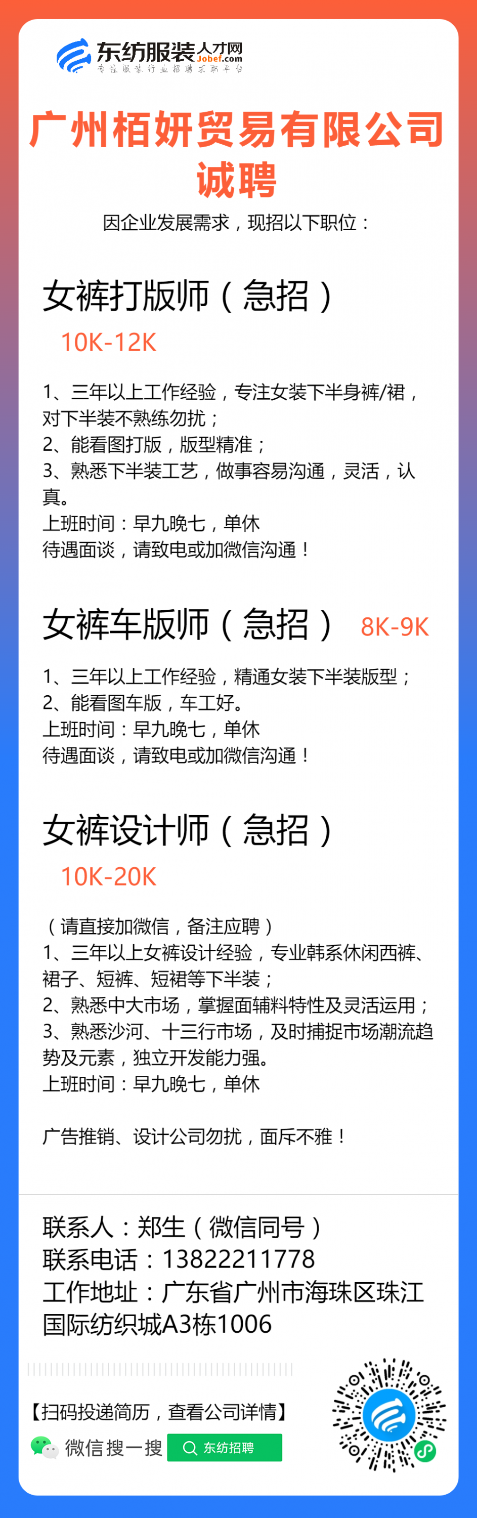 广州栢妍贸易有限公司职位:服装设计师//女装设计师/女裤设计师/纸样师/打版师/车版师/样衣工/打版兼车版