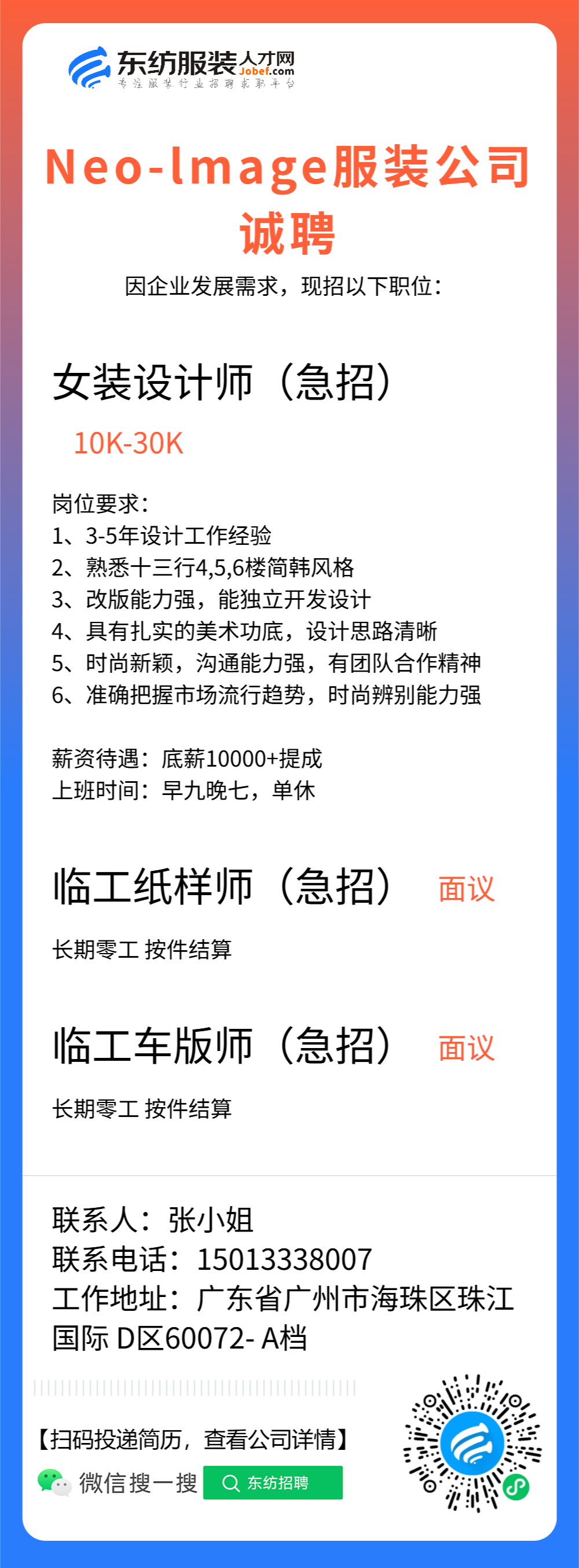 Neo-lmage服装公司职位:女装设计师/服装设计师/临工车版师/样衣工/临工纸样师/打版师