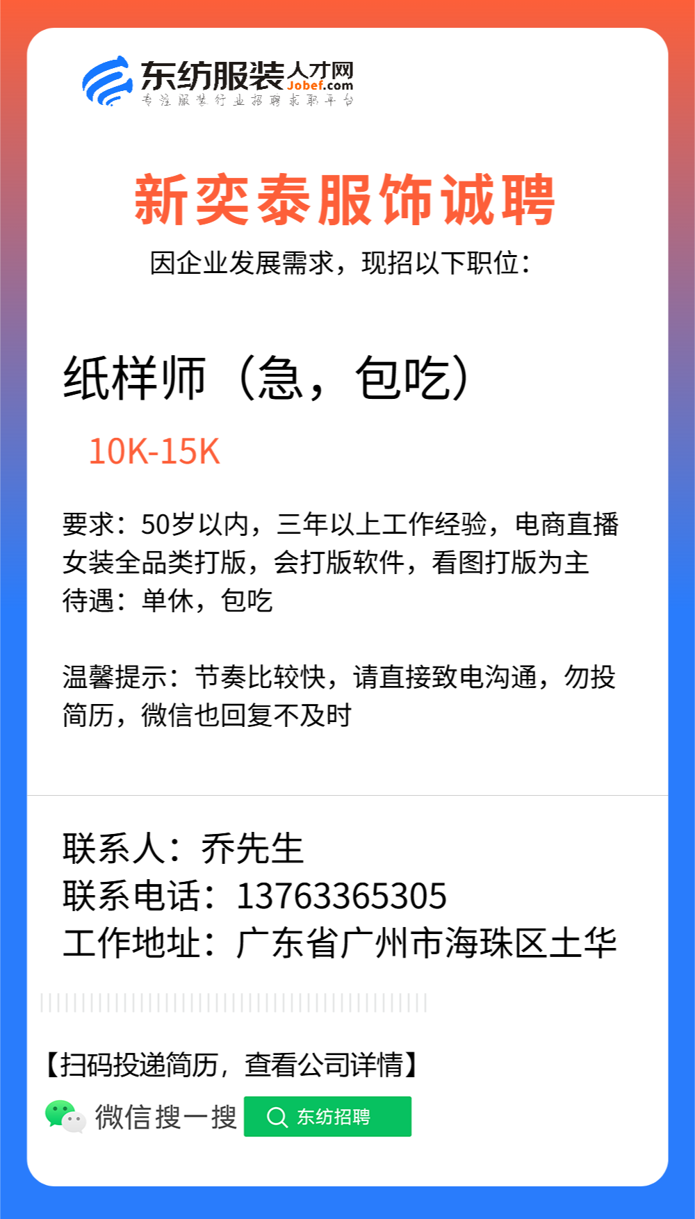 •  联系时,请一定说明在东纺服装人才网看到的,谢谢!见面最安全,发现问题请举报。