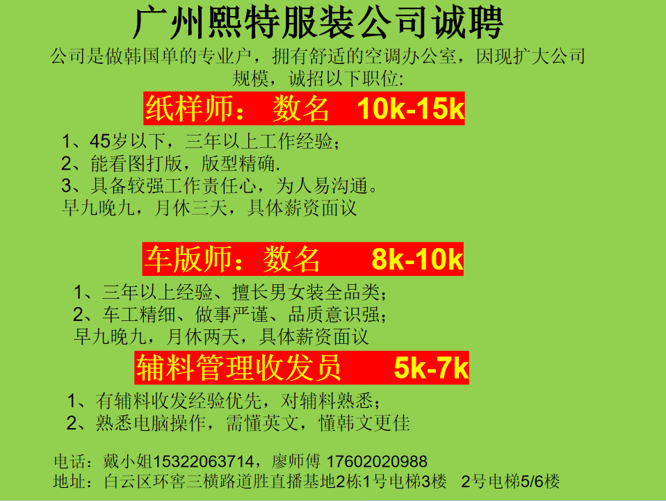 广州熙特服装公司职位:纸样师/打版师/车版师/样衣工/打版兼车版/车版衣/仓库专员/仓库文员/收货/拿货专员/纺织工艺