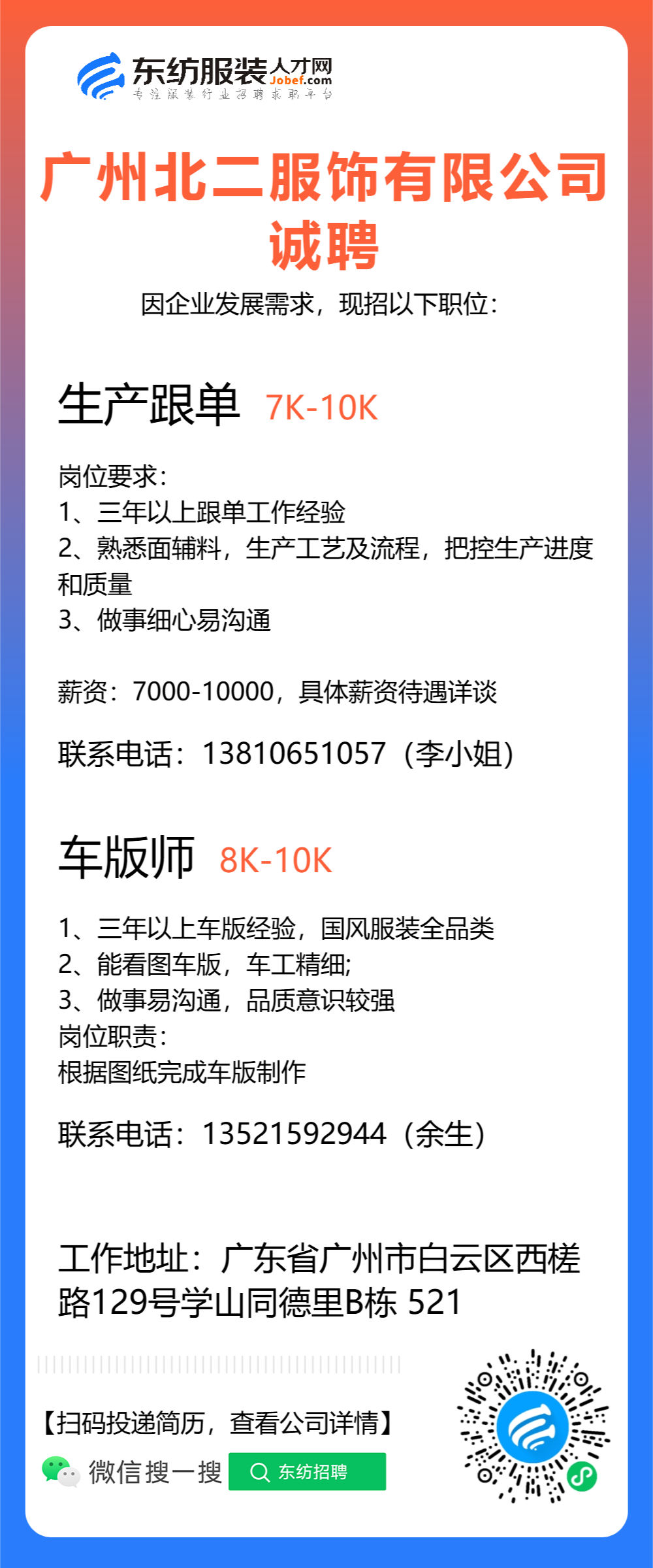 广州北二服饰有限公司职位:车版师/样衣工/车版衣/生产跟单/跟单文员