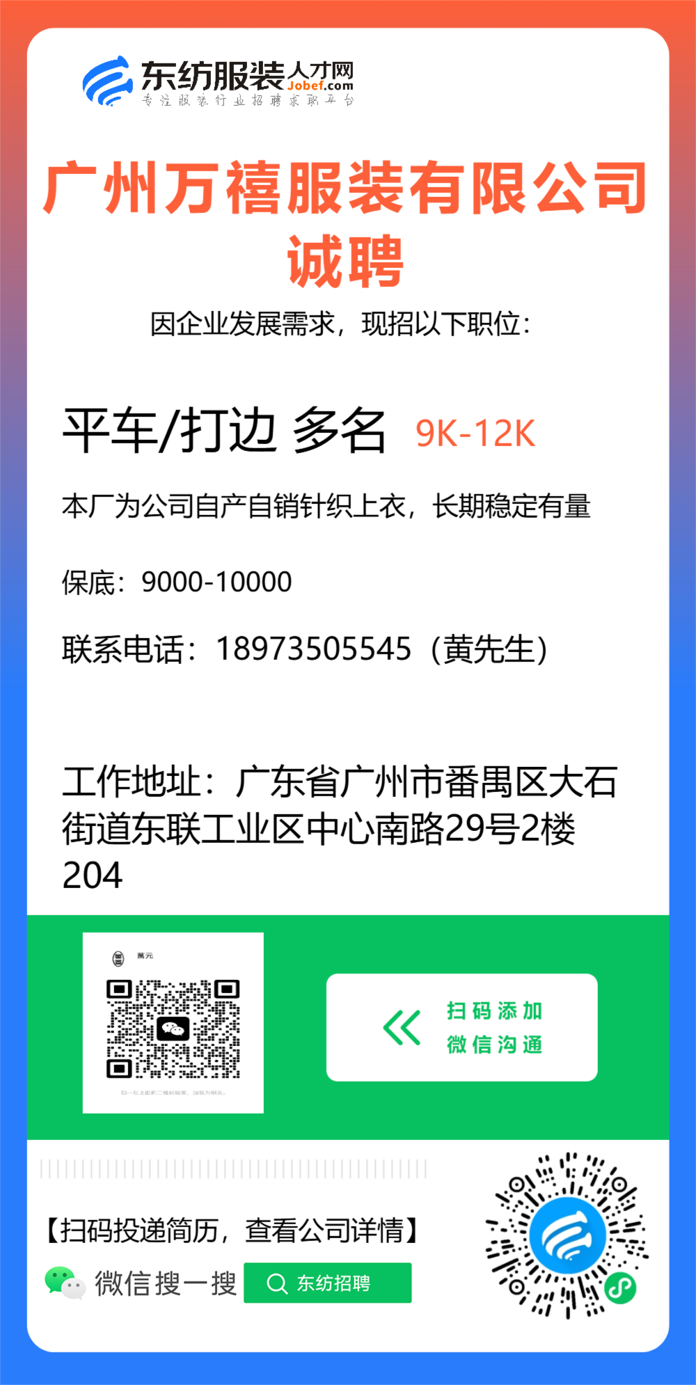 广州万禧服装有限公司职位:车位/车工/普工/四车/平车/四线/五线/整件/打边/车版师/样衣工/车版衣/生产跟单/跟单文员/销售/业务员/面辅料跟单员/专机/卷边