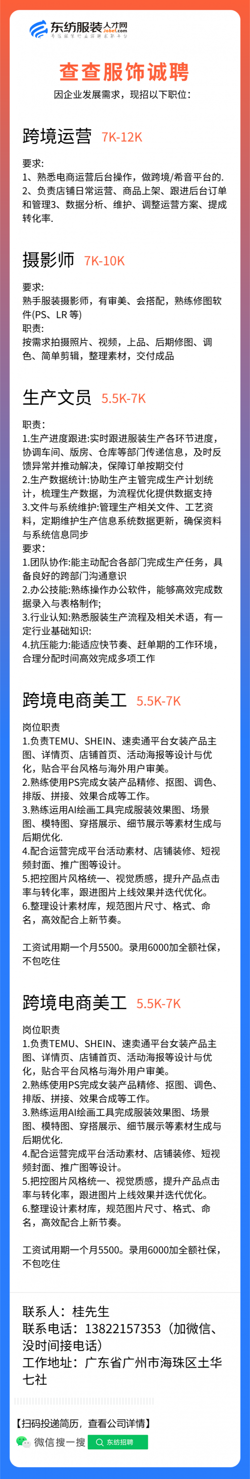 查查服饰职位:电商美工/平面设计/平面设计师/文案/编辑/电商运营/生产助理/文员/跟单文员/统计员/跟单助理/摄影师/剪辑师/运营助理