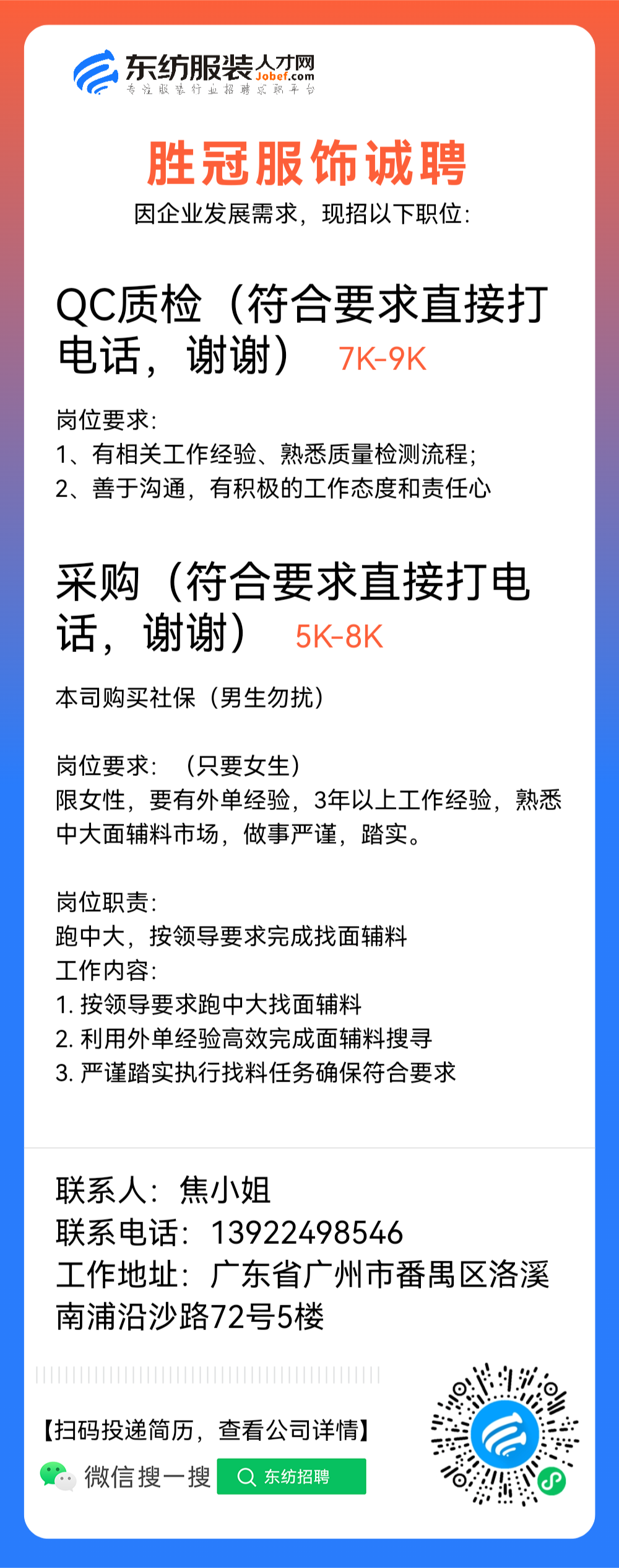 胜冠服饰职位:采购/采购主管/QC质检/采购助理
