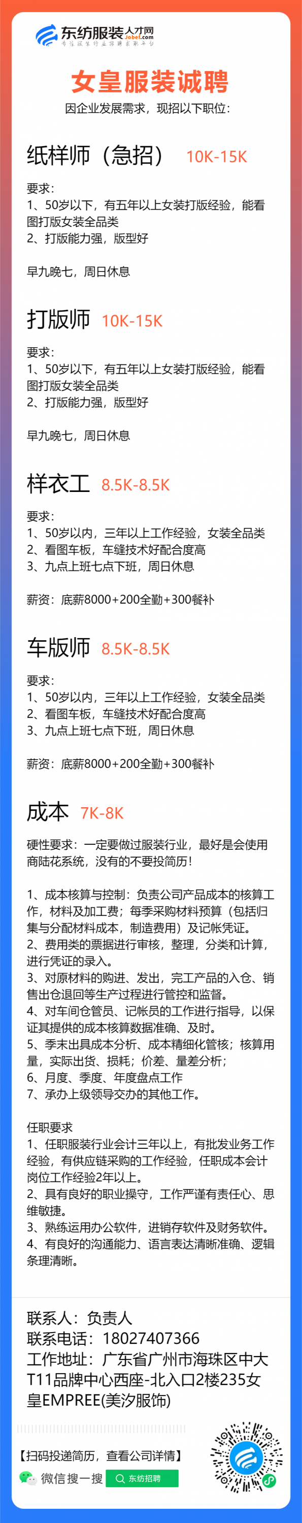 女皇服装职位:纸样师/打版师/车版师/样衣工/核价师