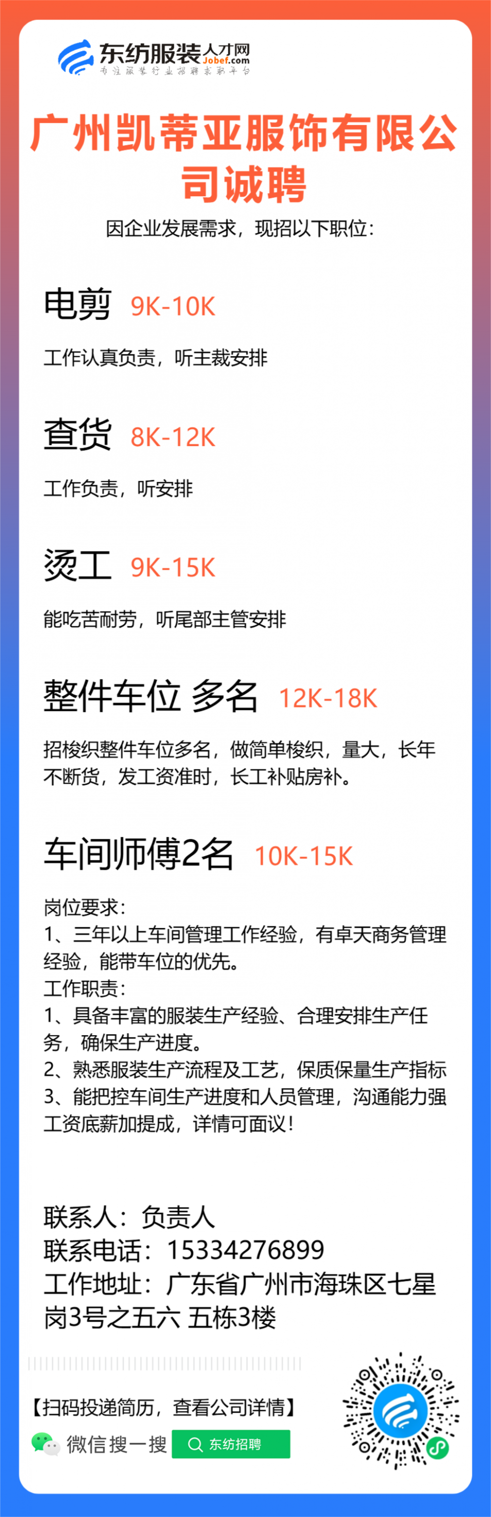 广州凯蒂亚服饰有限公司职位:车间组长//车间主管/车位/车工/查货/副裁/电剪/大烫/中烫/小烫