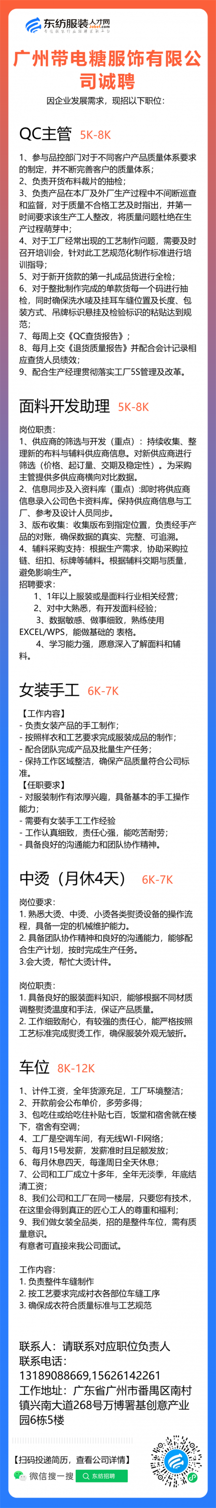 广州带电糖服饰有限公司职位:/大烫/中烫/小烫/手工/杂工/工艺员/平车/普工/四车/车位/车工/四线/五线/面辅料研发/开发/面料设计师//花型/图案设计/尾部主管