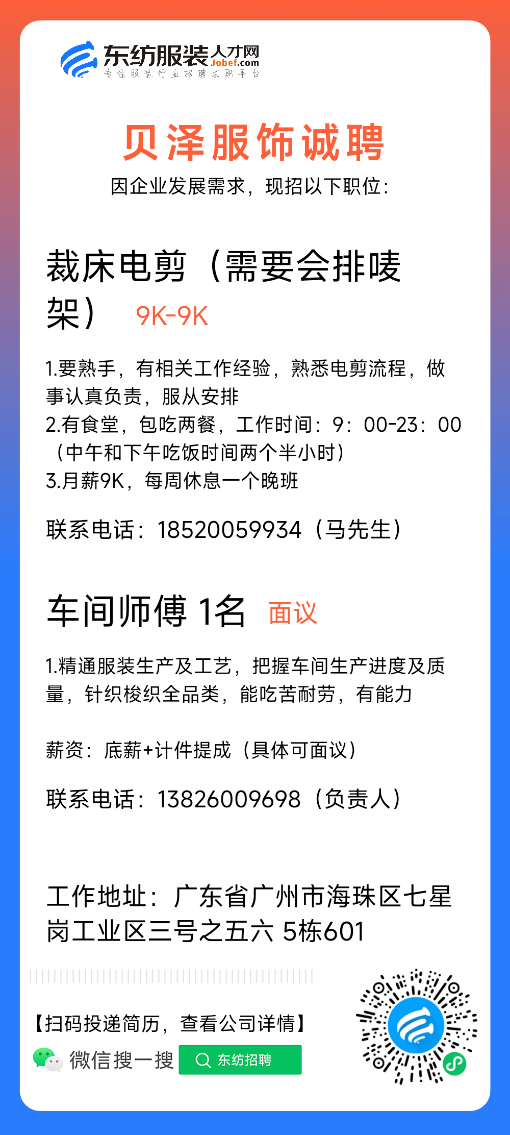 •  联系时,请一定说明在东纺服装人才网看到的,谢谢!见面最安全,发现问题请举报。