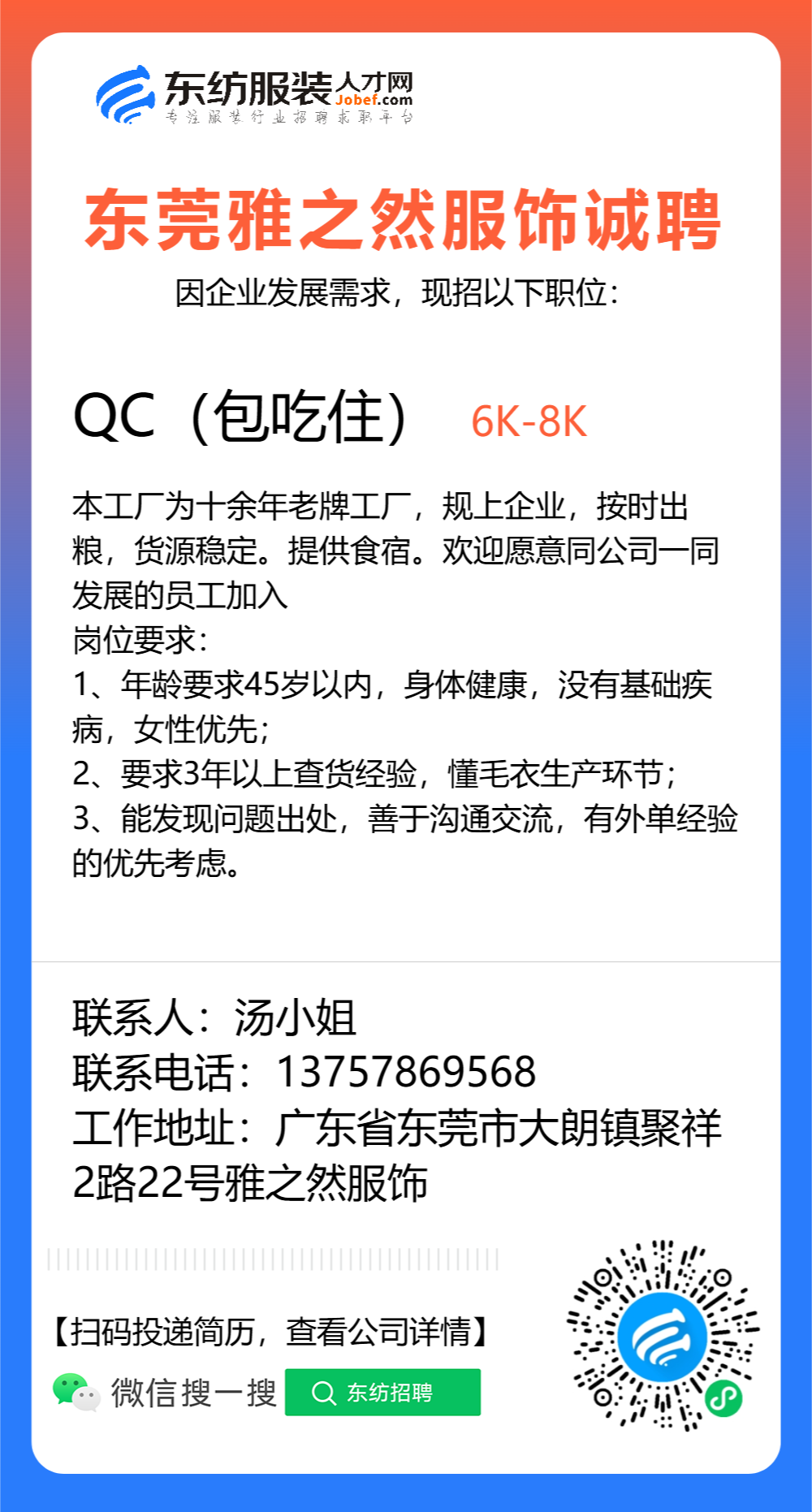 注:应聘或发邮件联系时,请注明该招聘信息来源于 东纺服装人才网www.jobef.com 谢谢!