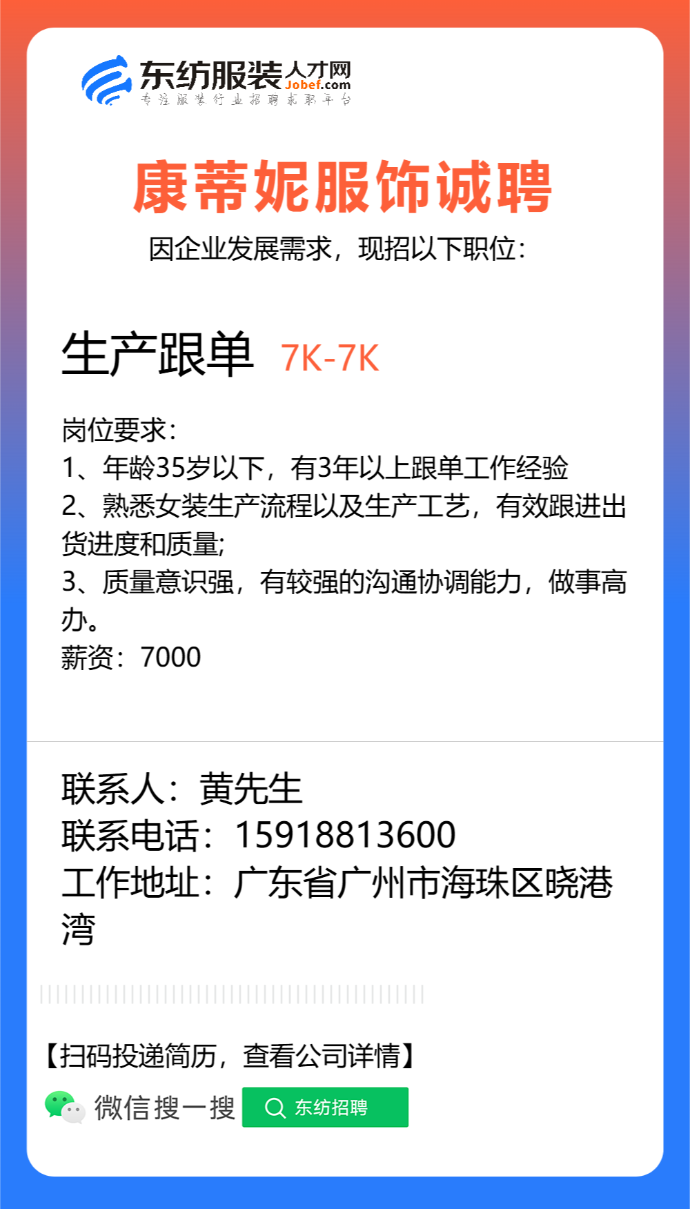 •  联系时,请一定说明在东纺服装人才网看到的,谢谢!见面最安全,发现问题请举报。