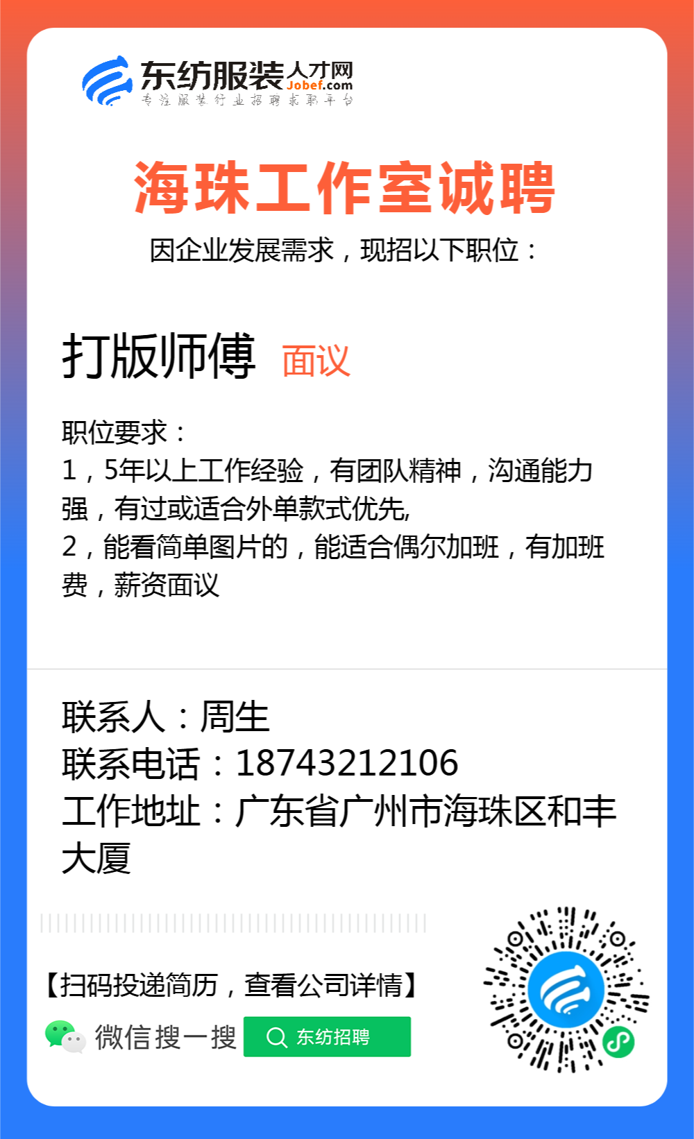•  联系时,请一定说明在东纺服装人才网看到的,谢谢!见面最安全,发现问题请举报。