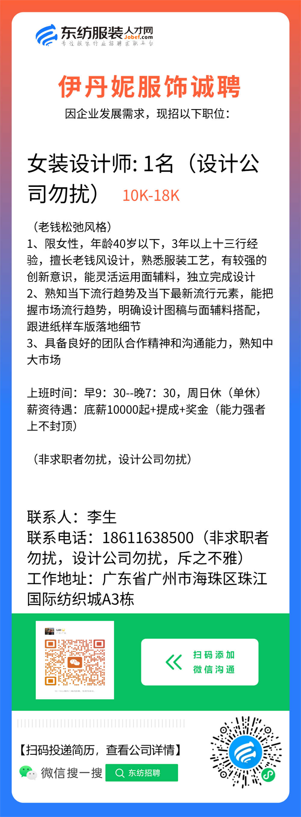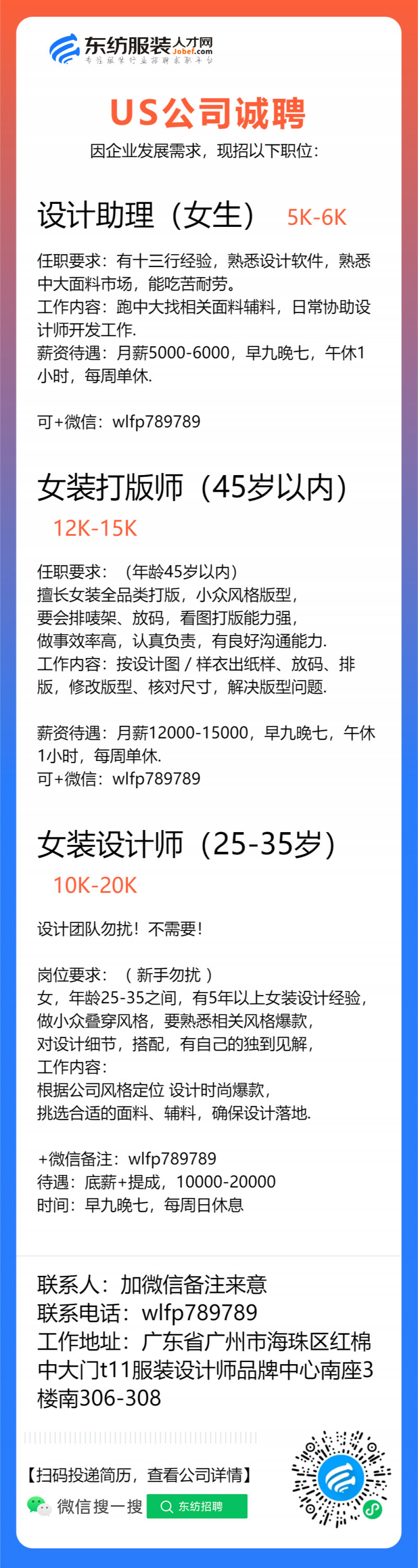 服装设计师/首席设计师/主设计师/女装设计师/车版师/样衣工/纸样师/打版师/库管员/QC质检/查货/设计助理/裁版师/工艺师/生产跟单