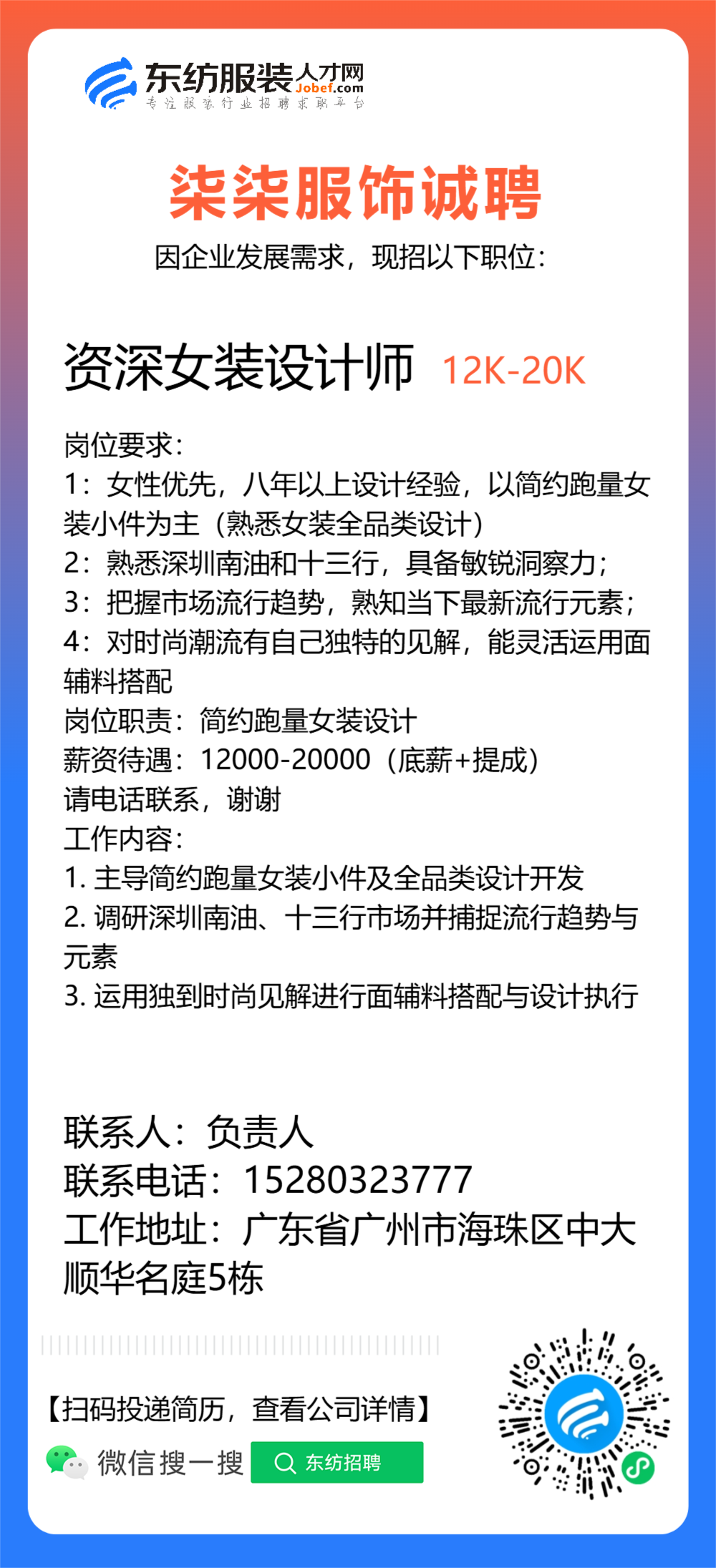老板助理/女装设计师/服装设计师/首席设计师/主设计师/车版师/样衣工/临工尾部专员/仓库专员/纸样师/打版师