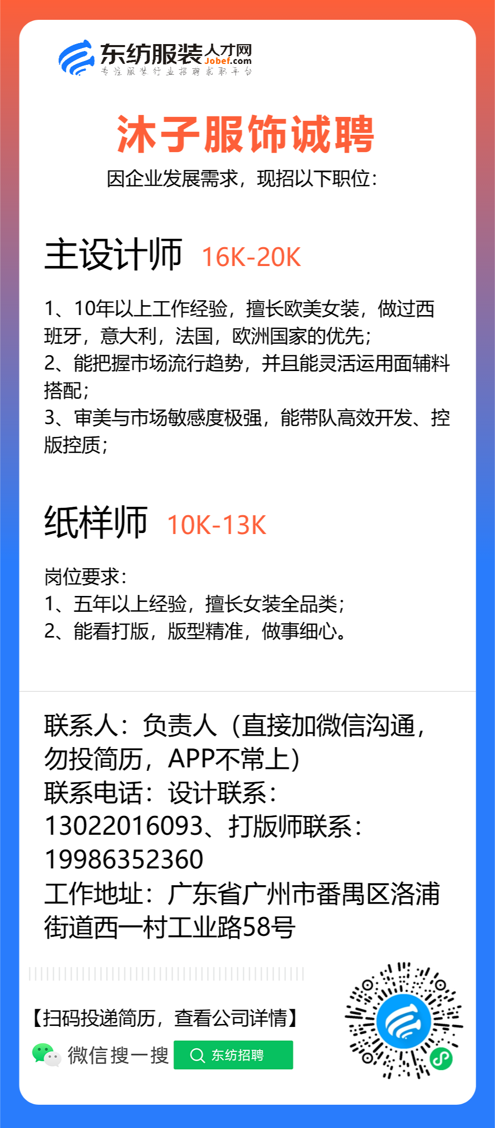 服装设计师/首席设计师/主设计师/设计总监/设计助理/女装设计师/纸样师/打版师/打版兼车版/版房主管/生产厂长/主管/车间组长/车间主管/生产经理/生产总监