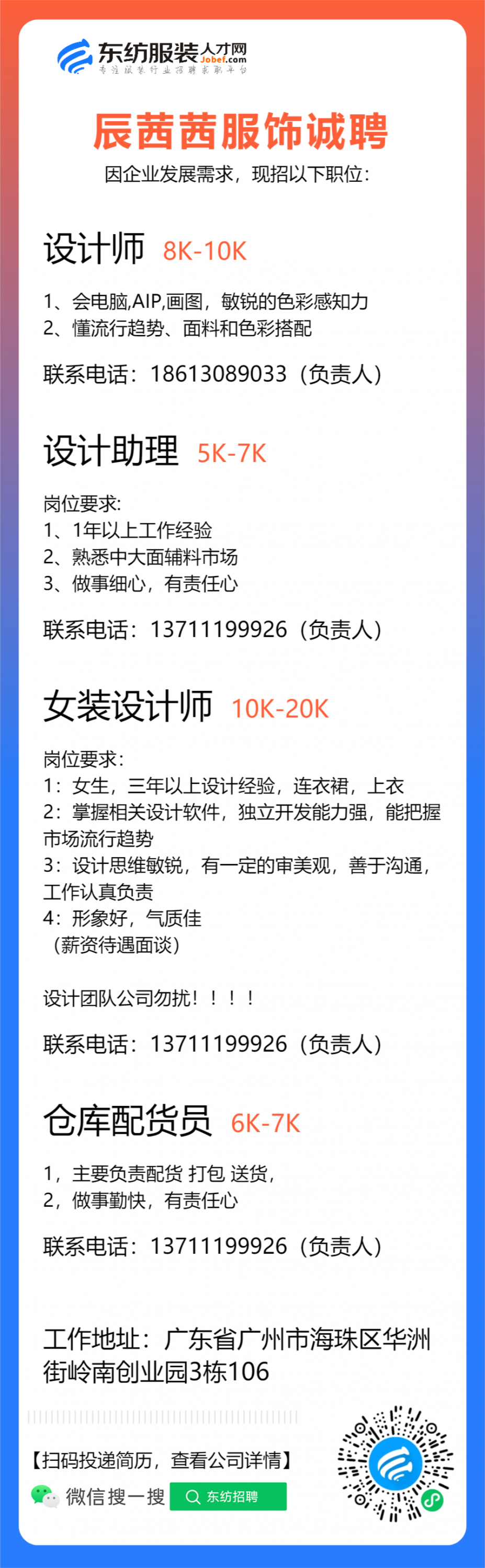 服装设计师/首席设计师/主设计师/女装设计师/车版师/样衣工/纸样师/打版师/库管员/QC质检/查货/设计助理/裁版师/工艺师/生产跟单