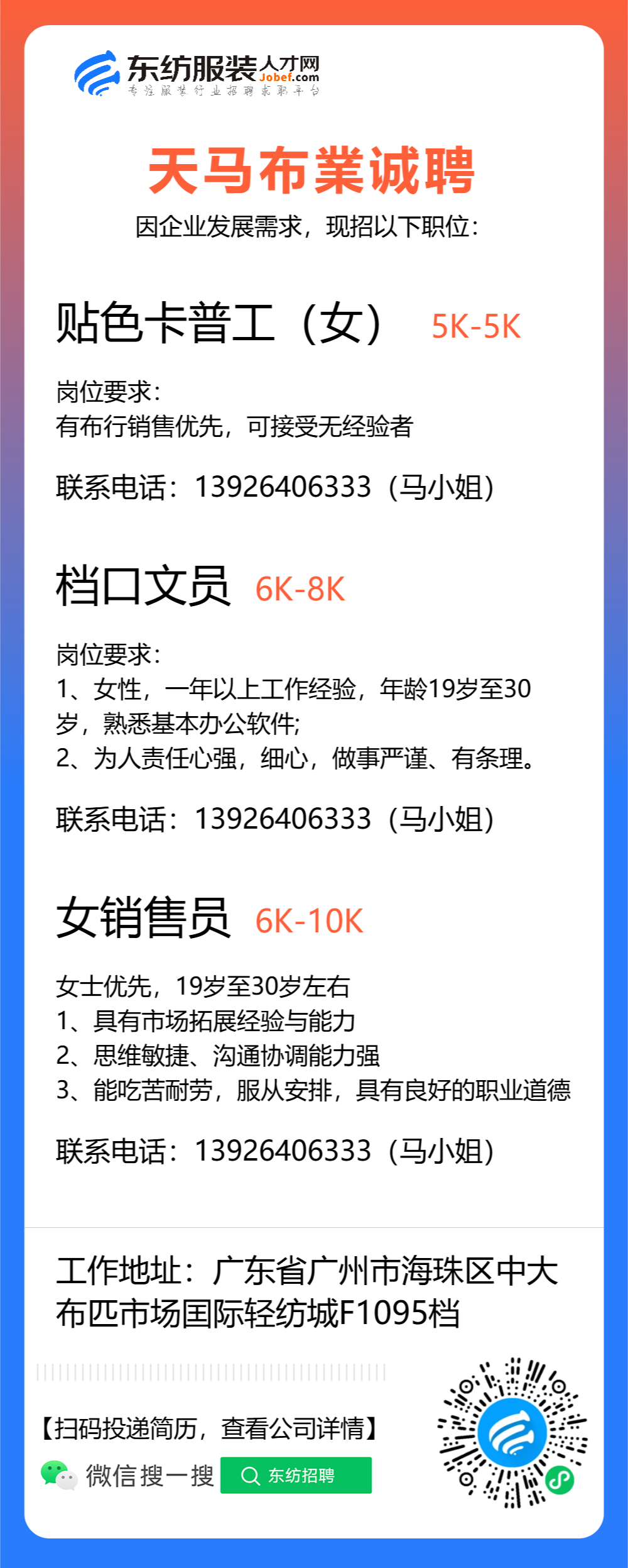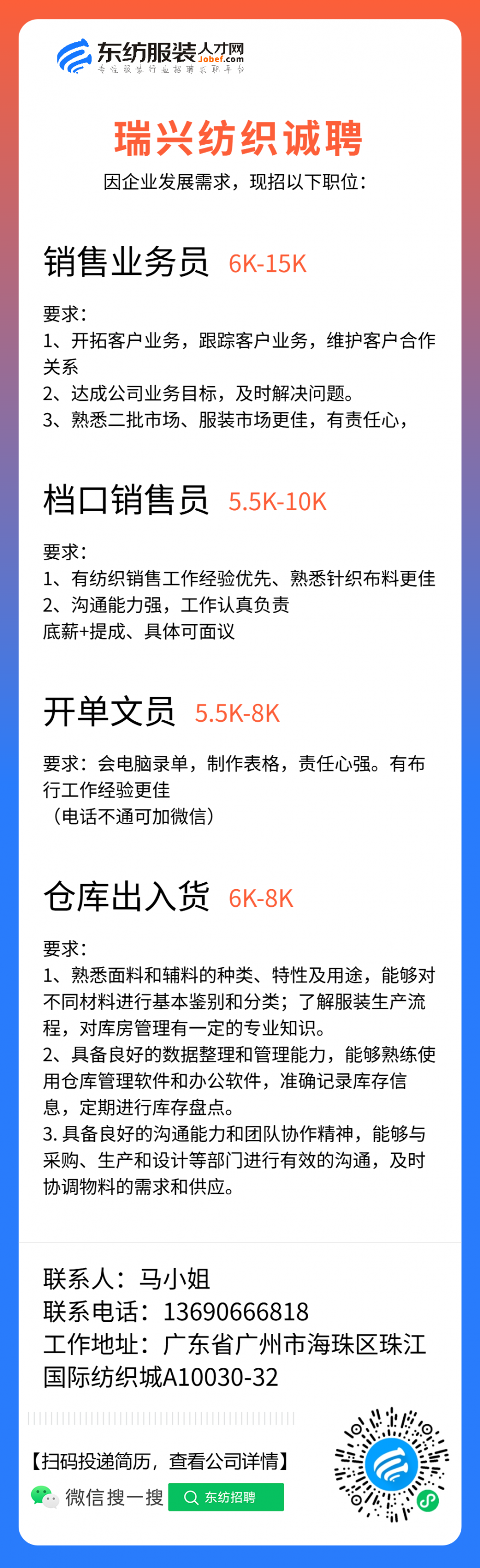 生产跟单/跟单文员/仓库文员/仓库专员/接待/前台/销售/业务员/销售助理/导购/营业员/营业员/销售员/开单文员/人事专员/库管员/收货/拿货专员/面料检验/验布员/面辅料研发/开发/普工