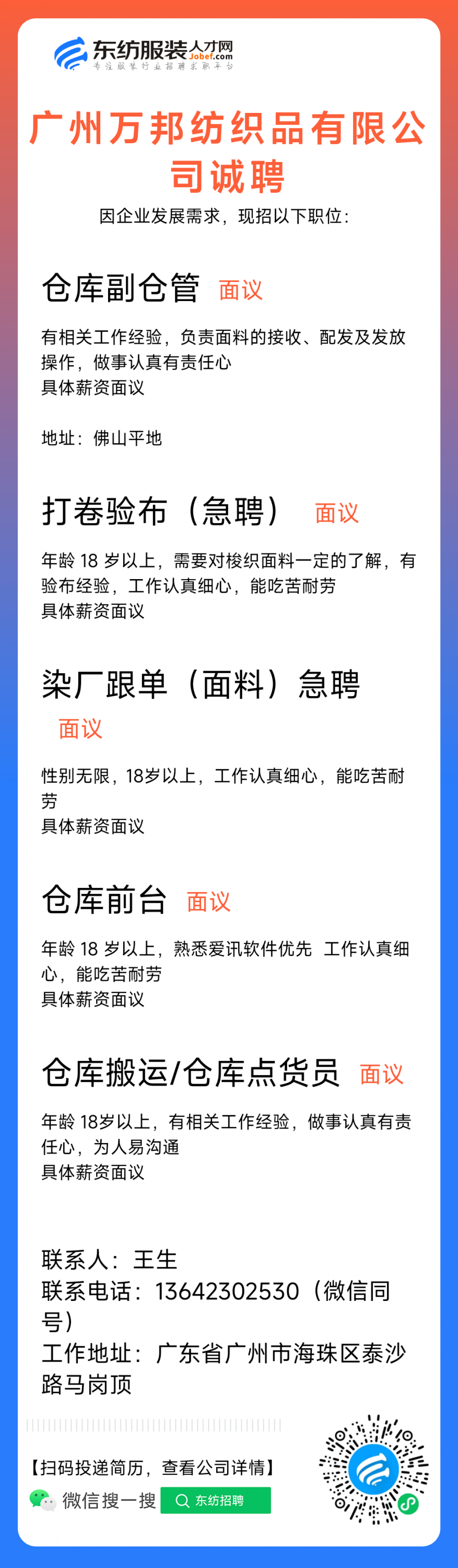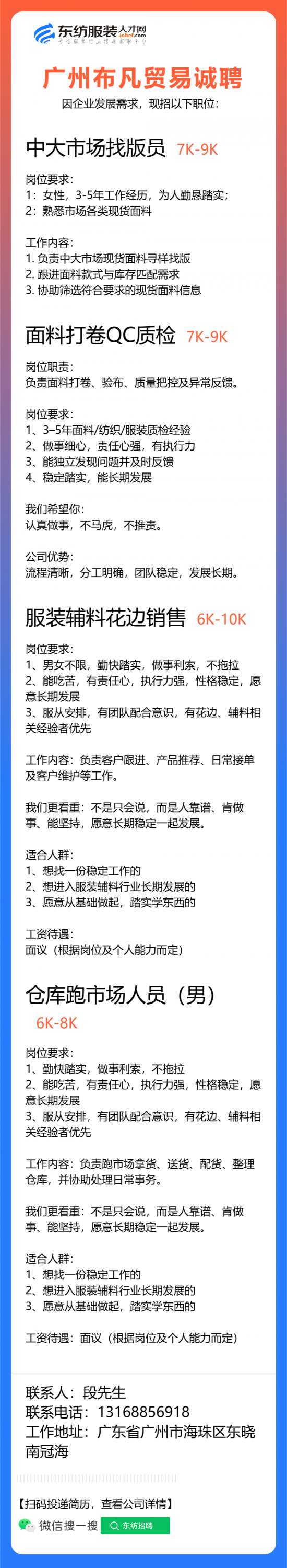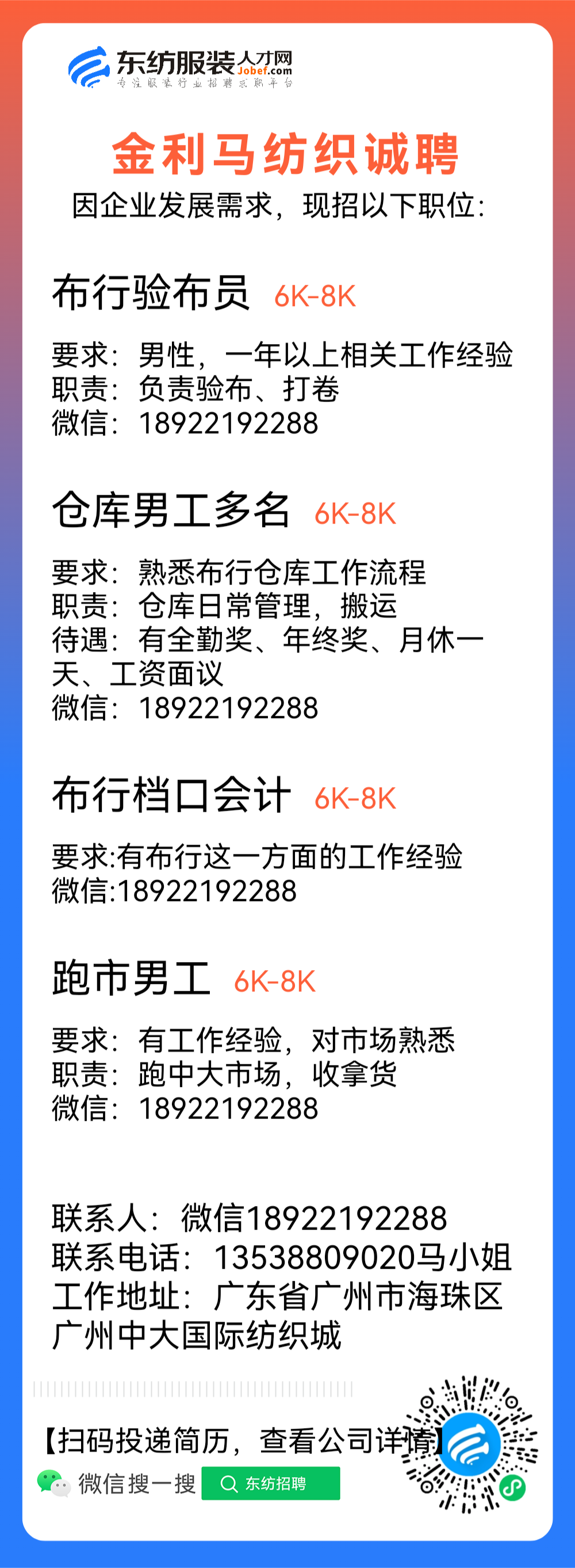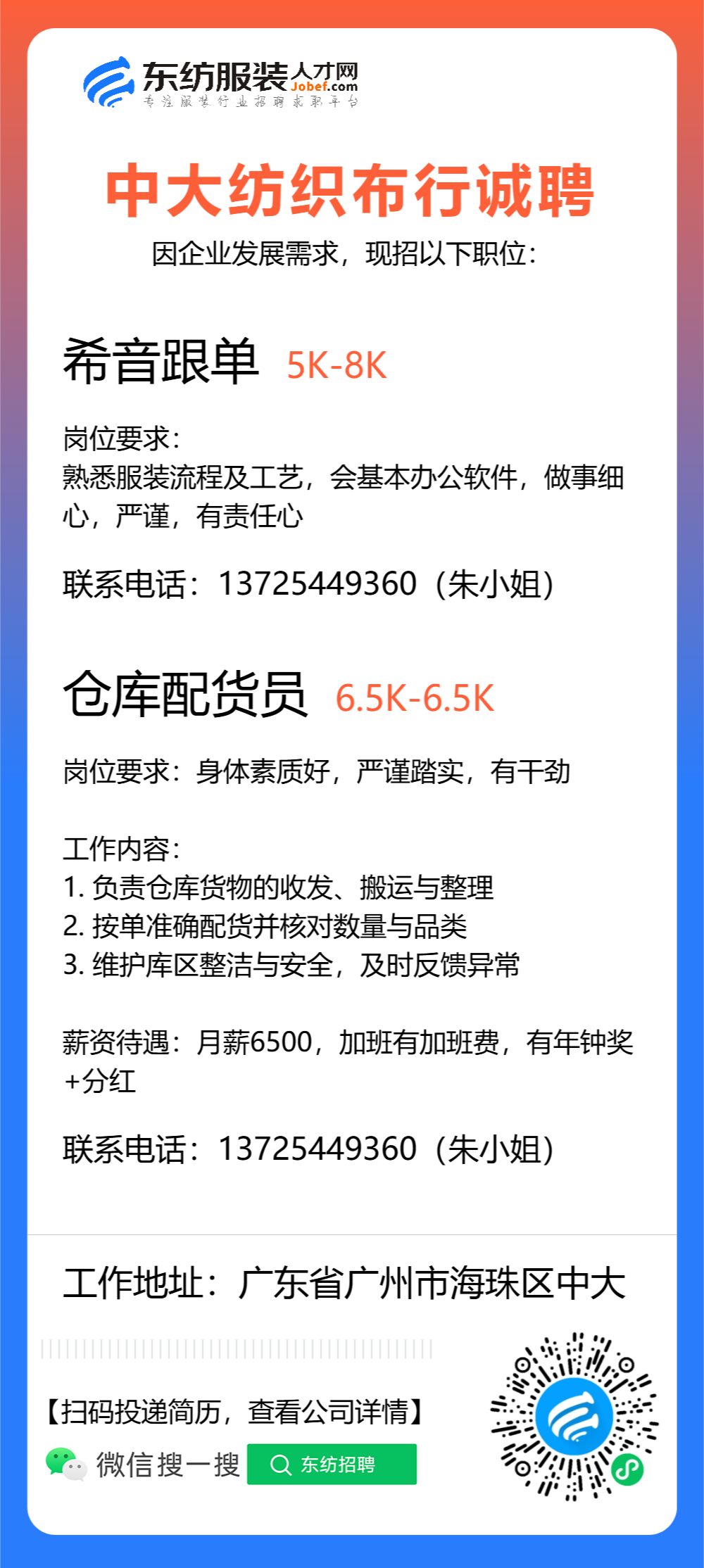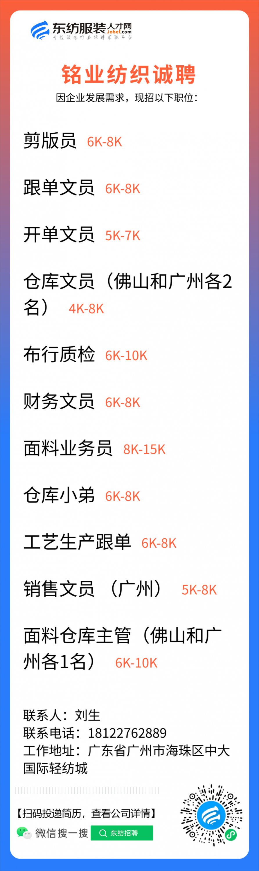 生产跟单/跟单文员/仓库文员/仓库专员/接待/前台/销售/业务员/销售助理/导购/营业员/营业员/销售员/开单文员/人事专员/库管员/收货/拿货专员/面料检验/验布员/面辅料研发/开发/普工