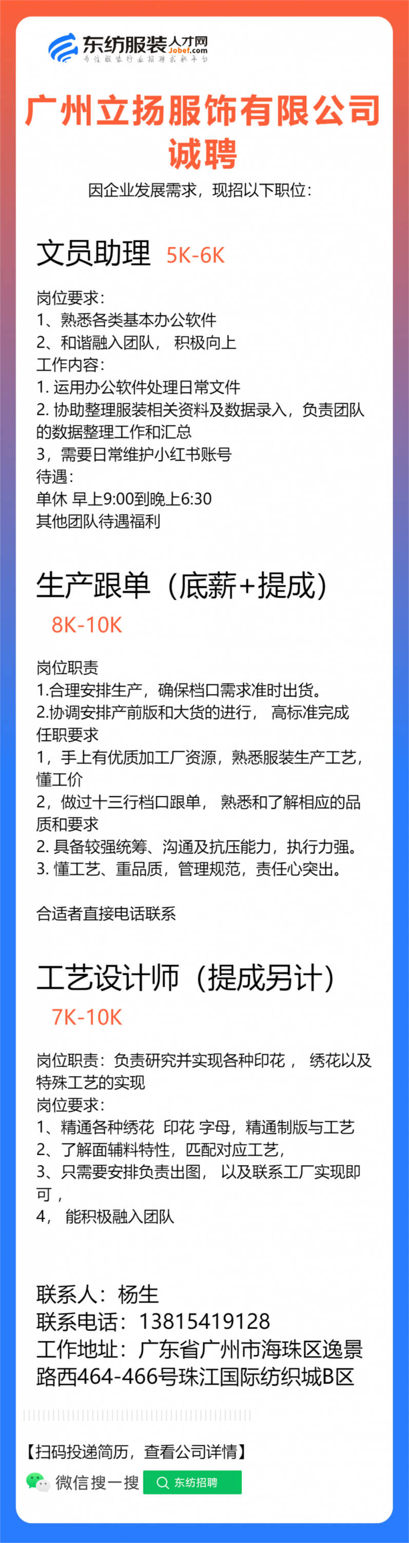 服装设计师/首席设计师/主设计师/女装设计师/车版师/样衣工/纸样师/打版师/库管员/QC质检/查货/设计助理/裁版师/工艺师/生产跟单