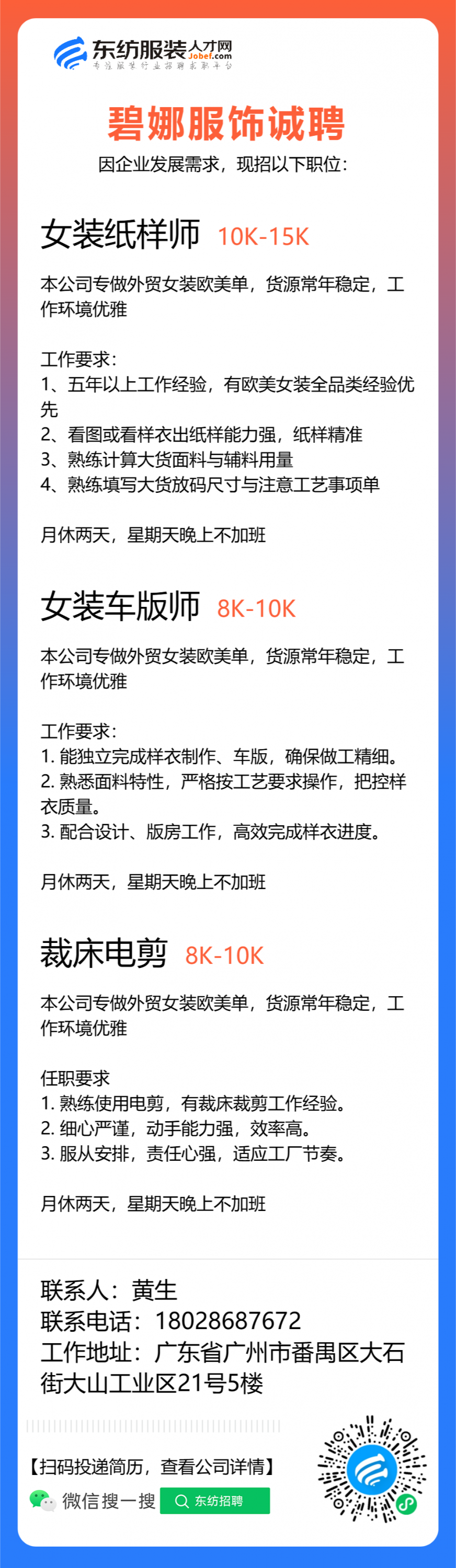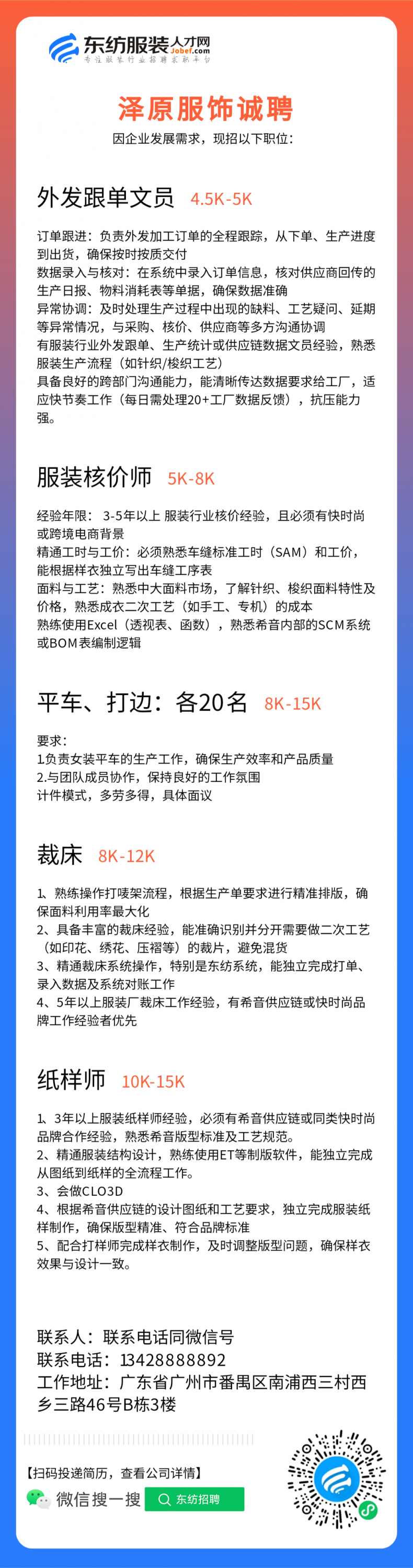 纸样师/打版师/生产厂长/主管/车间主管/车间组长/裁床/查货/车位/车工/中查/尾查/指导工/收发/生产跟单/尾部主管/生产助理/文员/副裁/电剪/QC质检/杂工/经理助理
