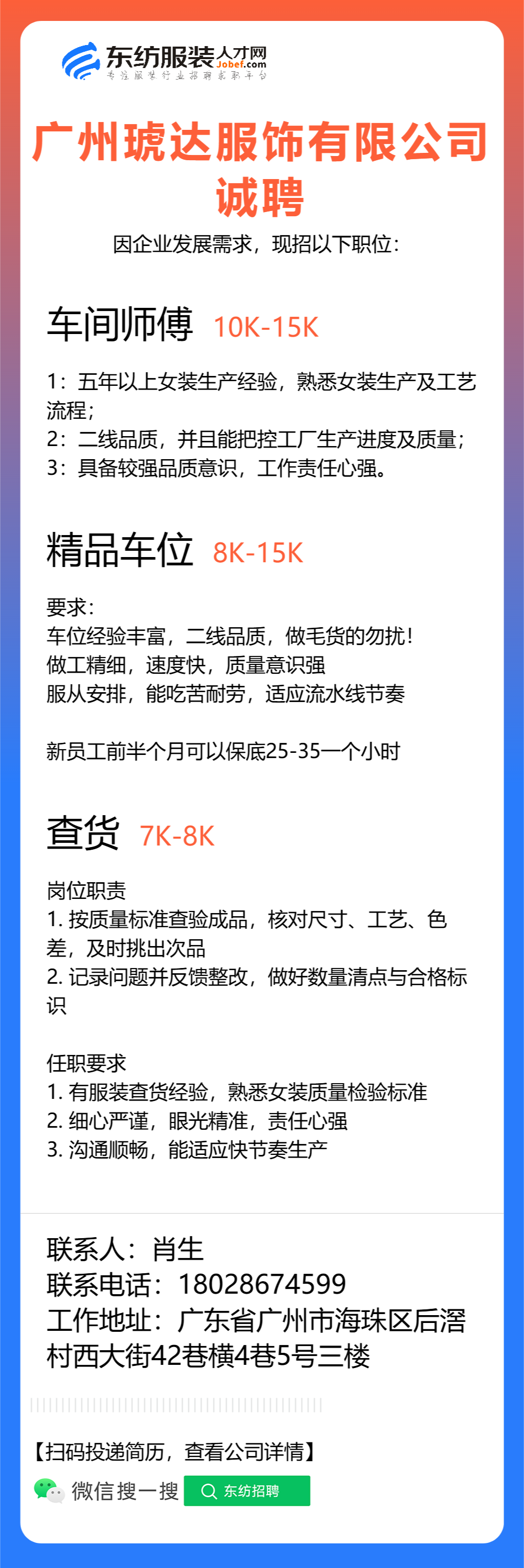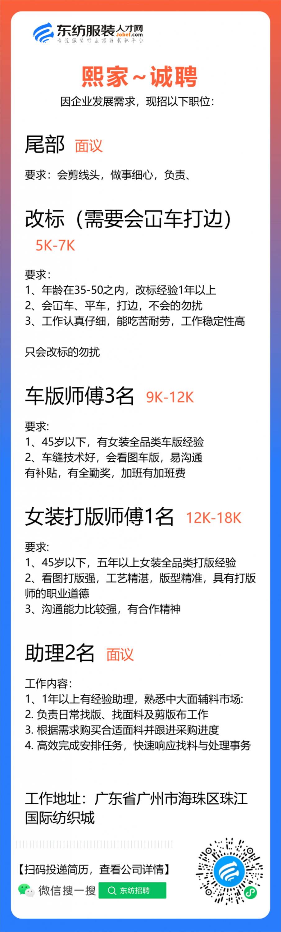 服装设计师/首席设计师/主设计师/女装设计师/车版师/样衣工/纸样师/打版师/库管员/QC质检/查货/设计助理/裁版师/工艺师/生产跟单