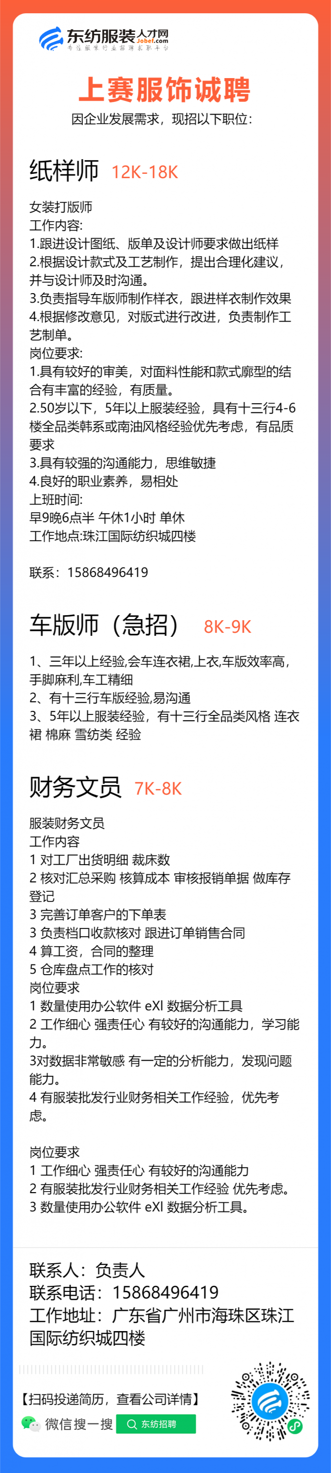 纸样师/打版师/生产厂长/主管/车间主管/车间组长/裁床/查货/车位/车工/中查/尾查/指导工/收发/生产跟单/尾部主管/生产助理/文员/副裁/电剪/QC质检/杂工/经理助理