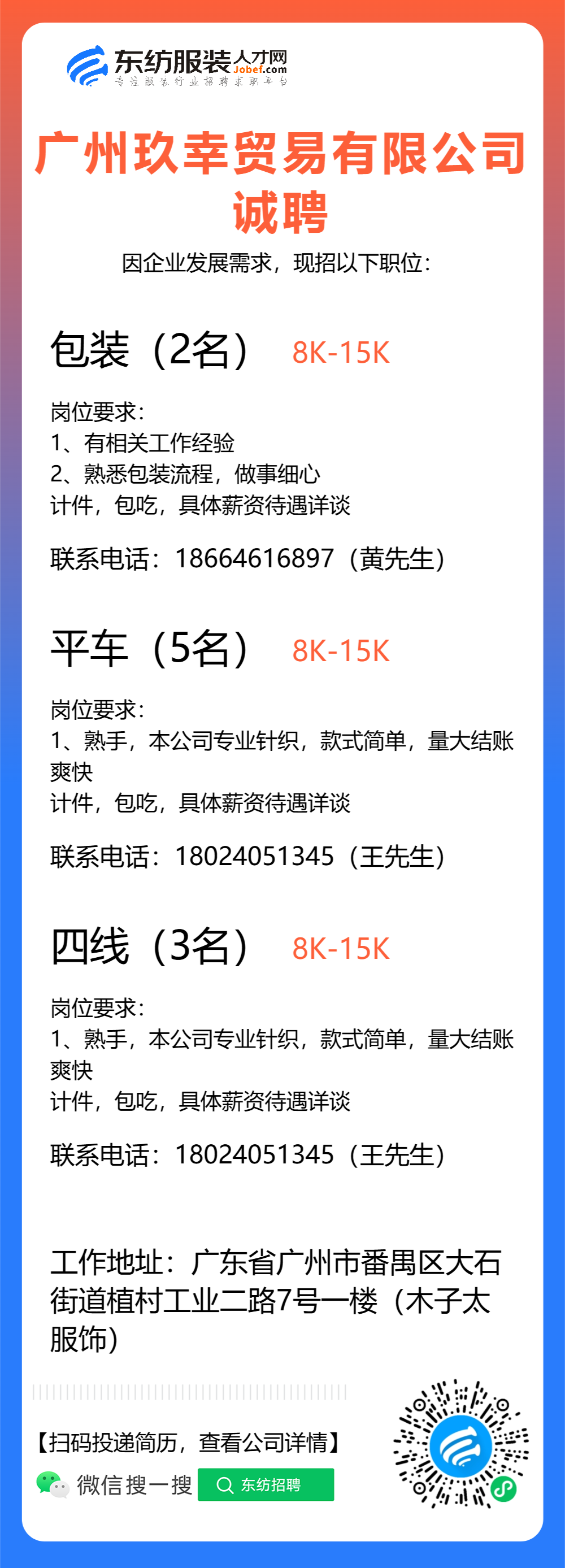 //平车/四线/普工/后道主管/仓库专员/成品打包