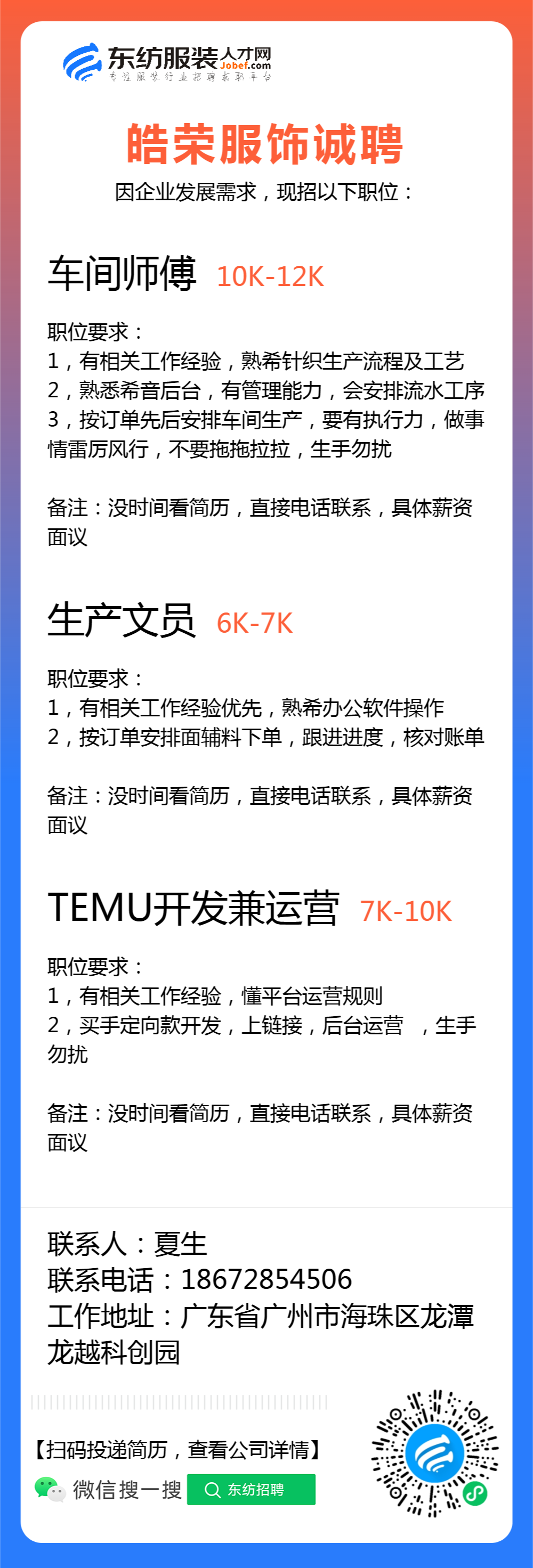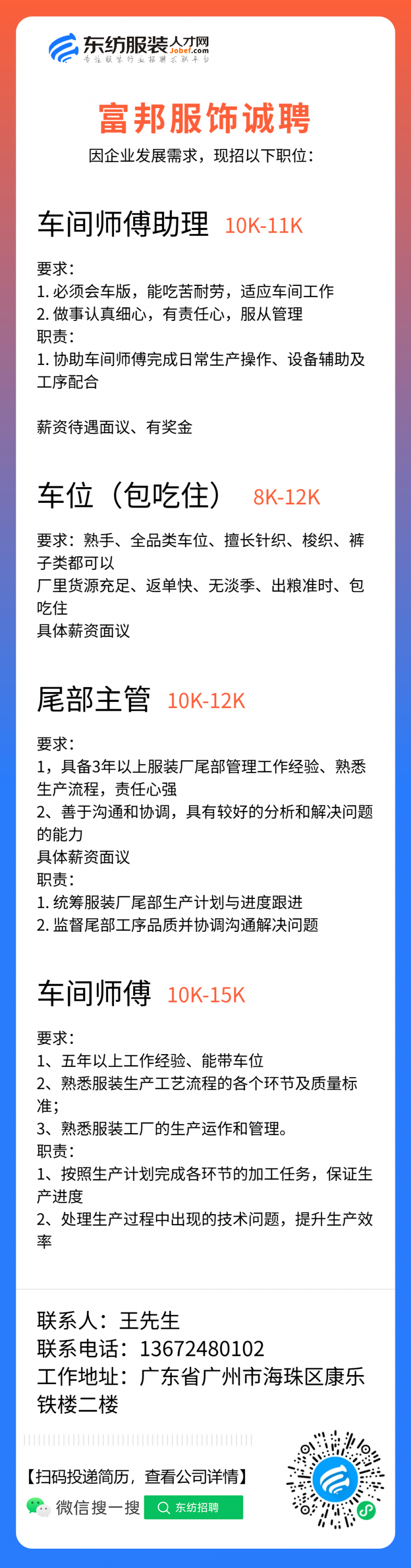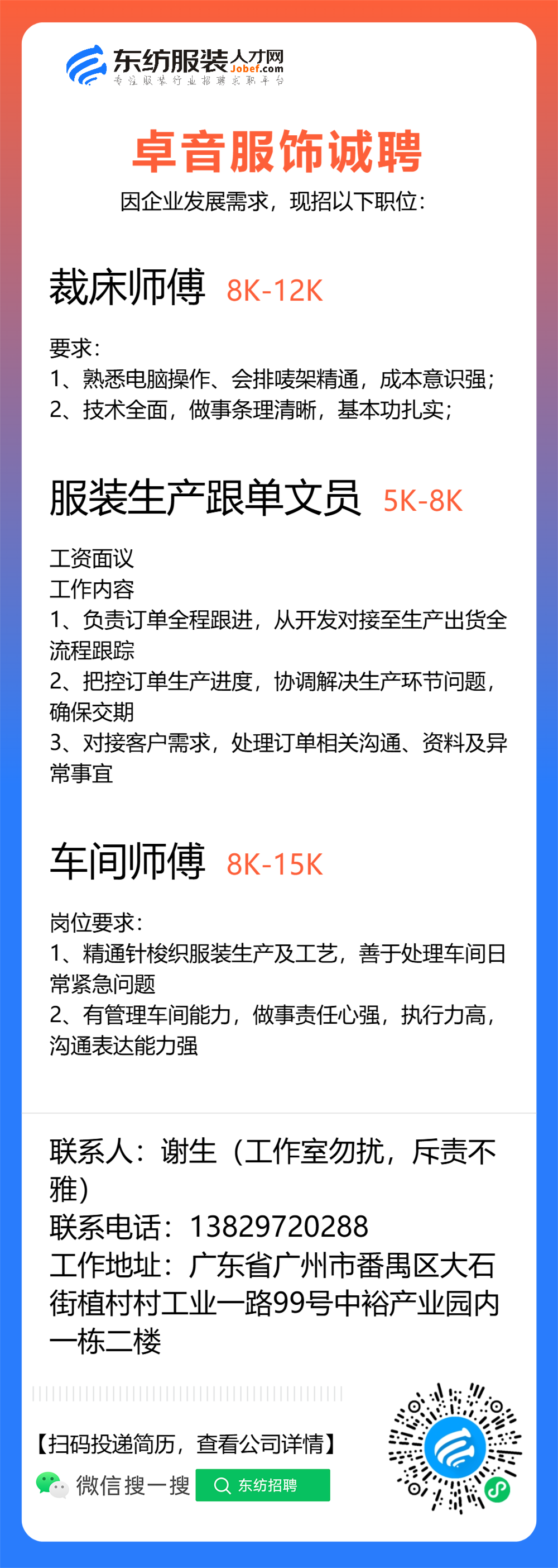 车间主管/车间组长/指导工/车位/车工/生产跟单/查货/大烫/中烫/小烫/尾部主管/裁床/外发主管/生产助理/文员/跟单文员/办公室文员/普工/杂工/冚车/四线/副裁/电剪/平车/跟单助理//专机