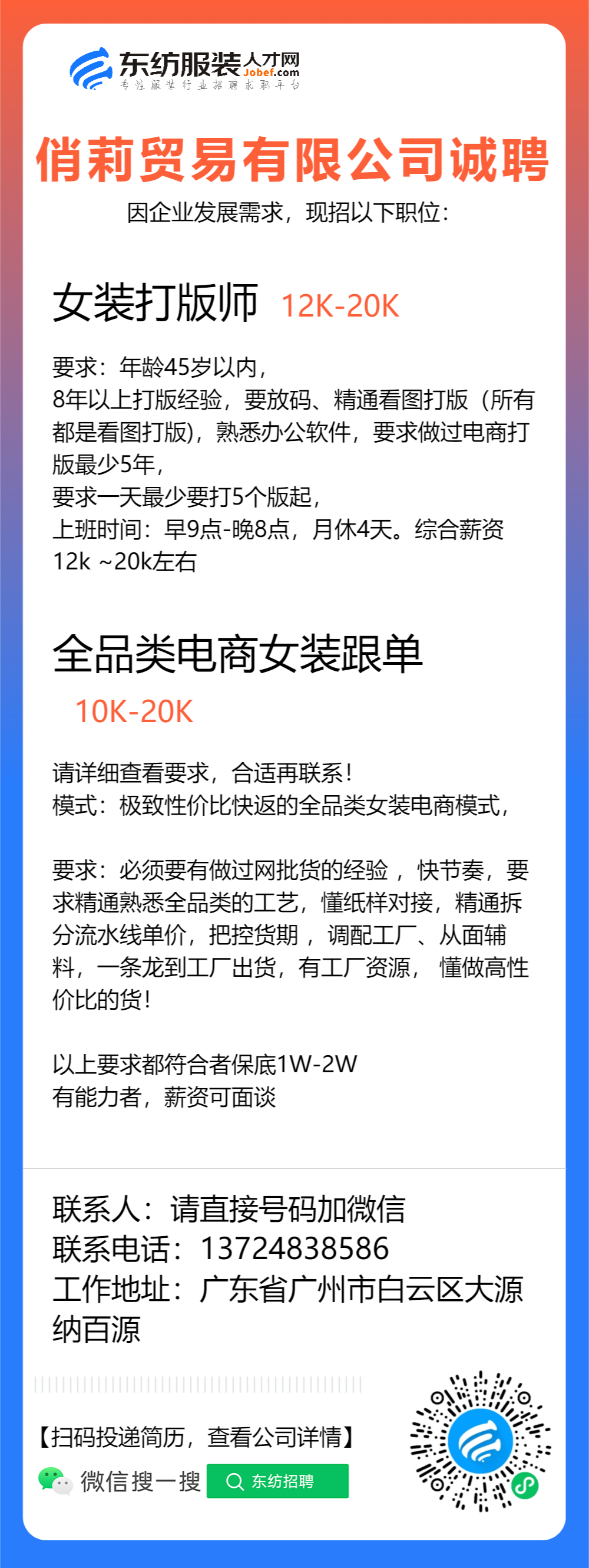 服装设计师/首席设计师/主设计师/设计总监/女装设计师/车版师/样衣工/车版衣/运营助理/电商运营/网络推广/纸样师/打版师/生产跟单/跟单助理