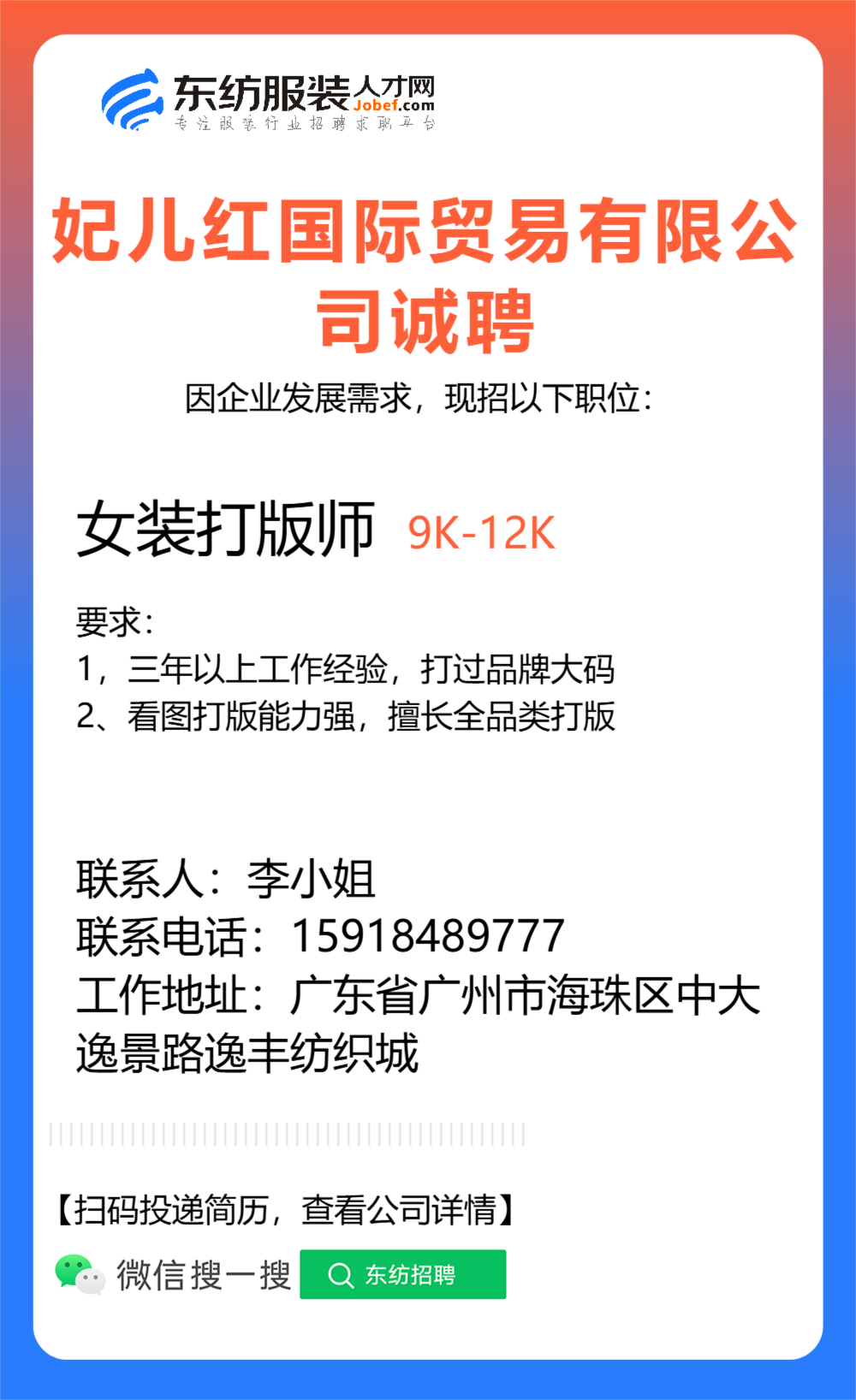 服装设计师/首席设计师/主设计师/设计总监/设计助理/女装设计师/纸样师/打版师/打版兼车版/版房主管/生产厂长/主管/车间组长/车间主管/生产经理/生产总监