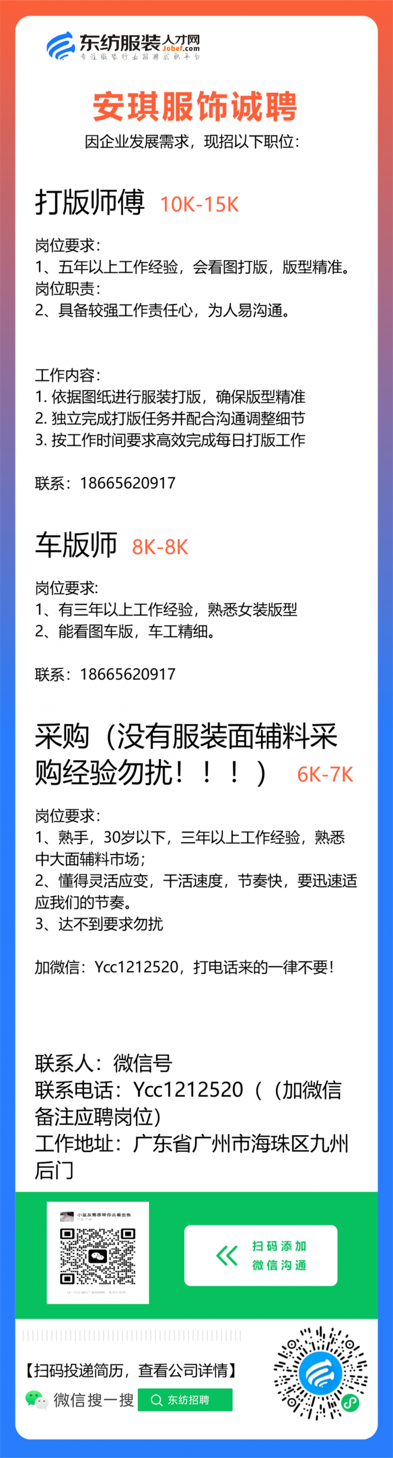 服装设计师/女装设计师/车版师/样衣工/跟单助理/销售/业务员/外贸跟单/采购助理/纸样师/打版师/QC质检/生产跟单/采购/采购主管/外贸业务员//电商运营/跟单文员/外贸销售跟单