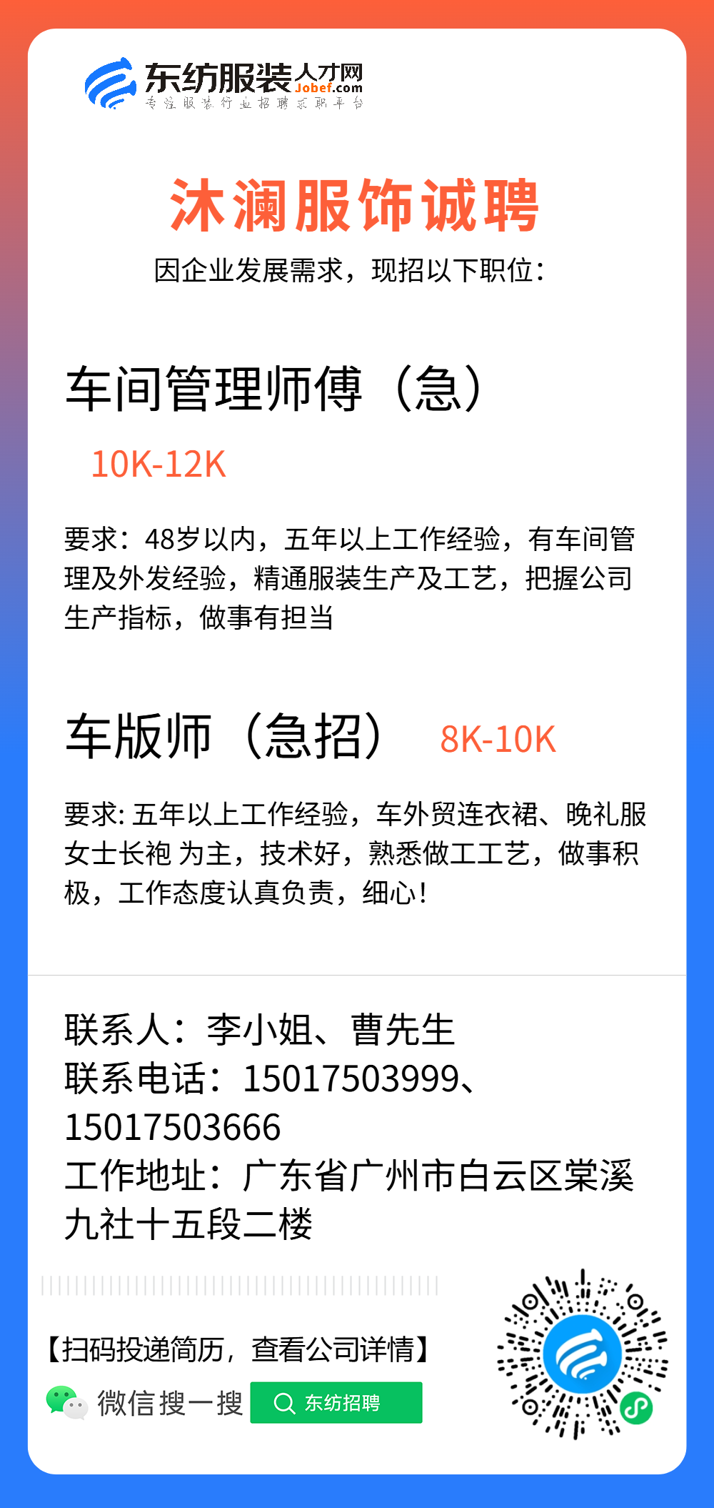 打版兼车版/车版师/样衣工/查货/中查/尾查/生产厂长/主管/车间主管/车间组长/生产经理/指导工