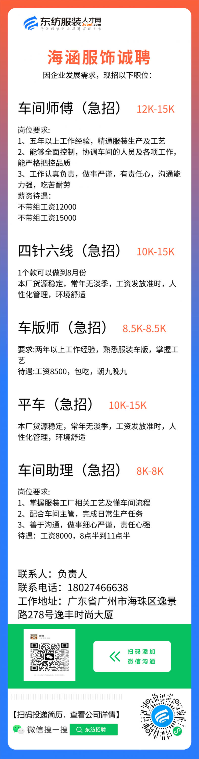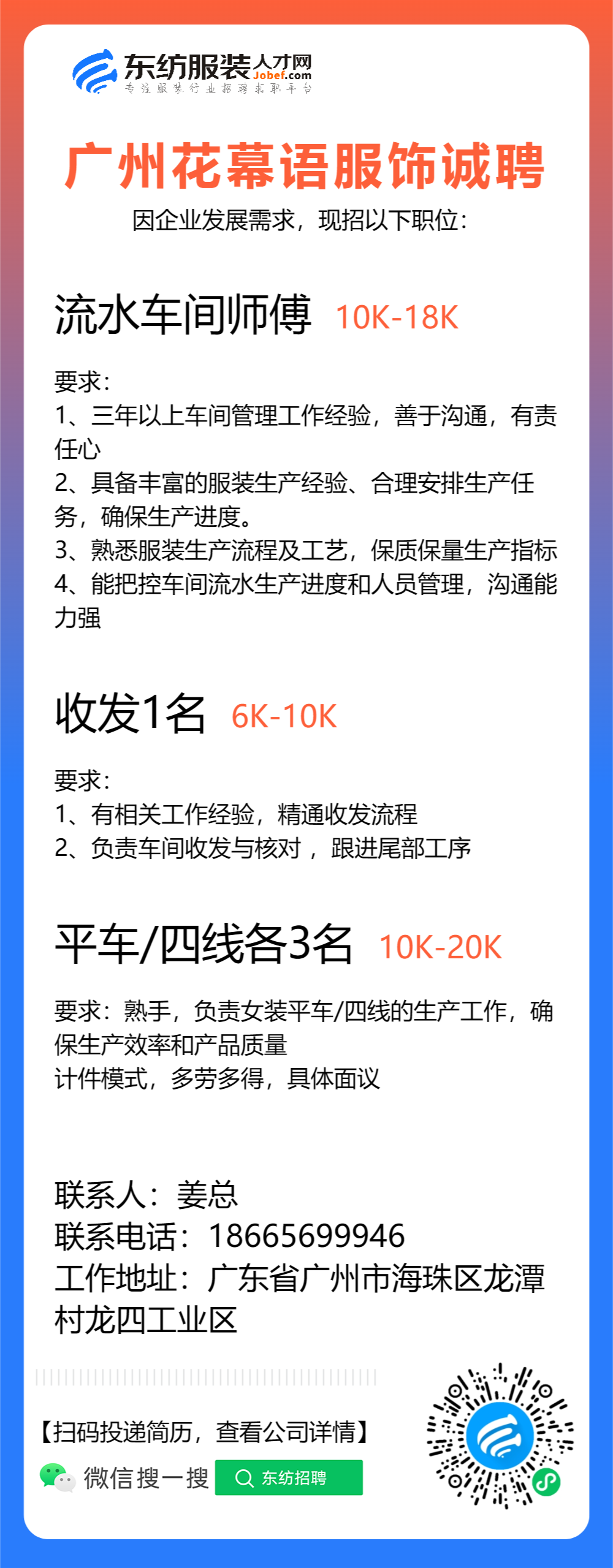 车间主管/车间组长/指导工/车位/车工/生产跟单/查货/大烫/中烫/小烫/尾部主管/裁床/外发主管/生产助理/文员/跟单文员/办公室文员/普工/杂工/冚车/四线/副裁/电剪/平车/跟单助理//专机