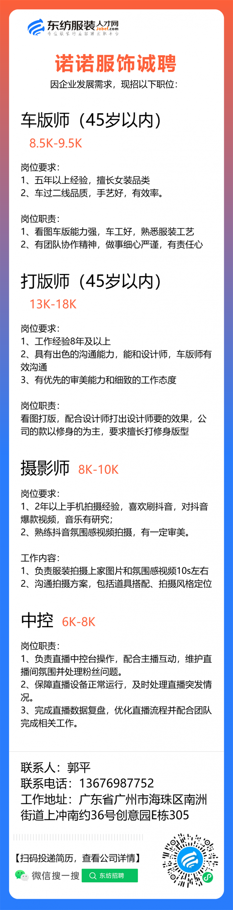 服装设计师/首席设计师/主设计师/设计总监/设计助理/女装设计师/助播/副播/场控/中控/电商主播/车版师/样衣工/车版衣