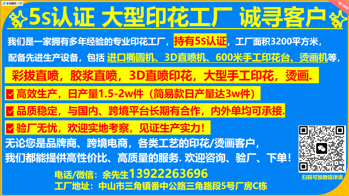 中山大型印花工厂诚寻客户(5s认证工厂)职位:工厂/工艺厂/中山印花工厂诚寻客户(5s认证工厂)