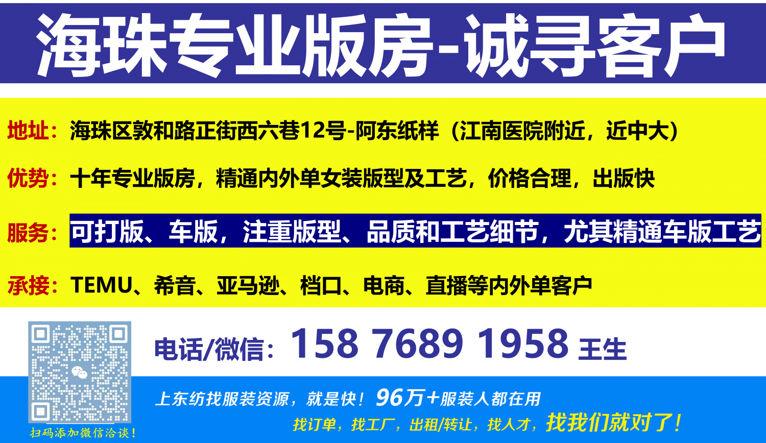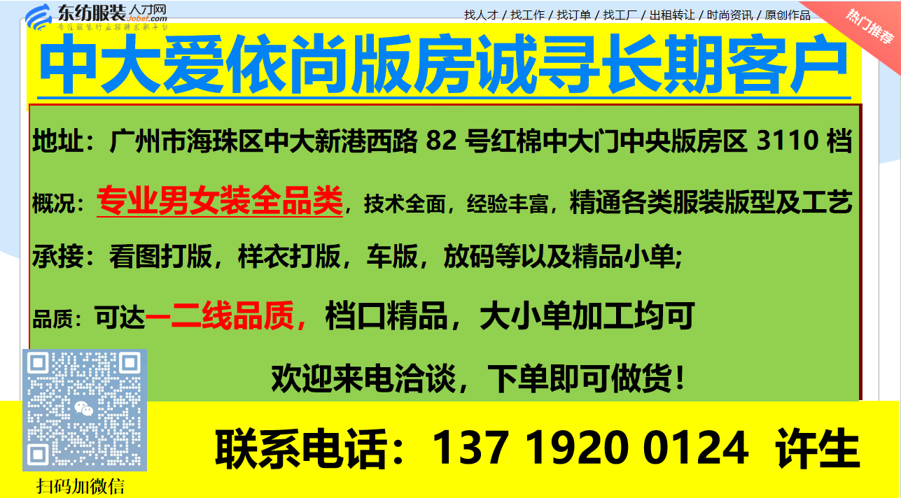 中大爱依尚版房诚寻长期客户职位:工厂/工作室(版房/设计/摄影)/其他/工艺厂
