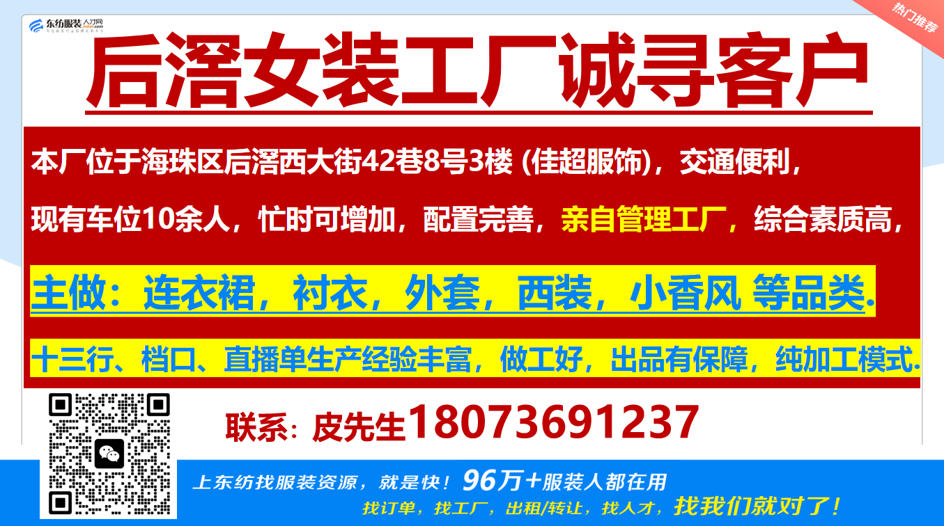 后滘女装工厂诚寻客户职位:工厂/后滘女装工厂诚寻客户/梭织
