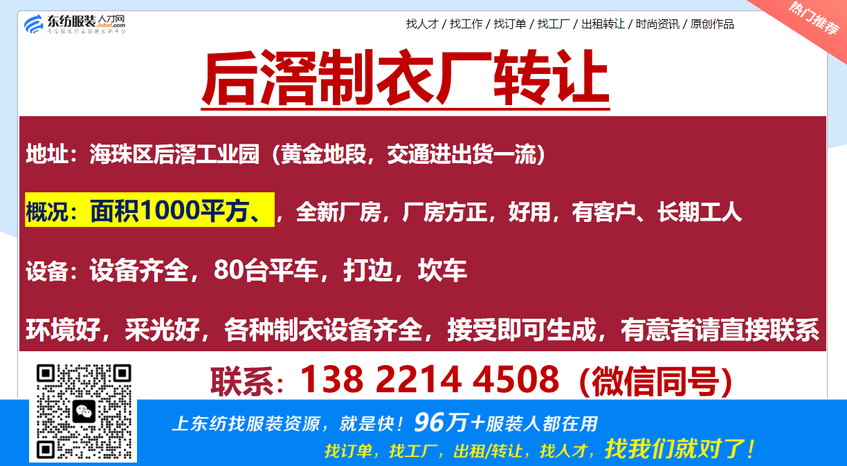 后滘制衣厂转让职位:出租转让