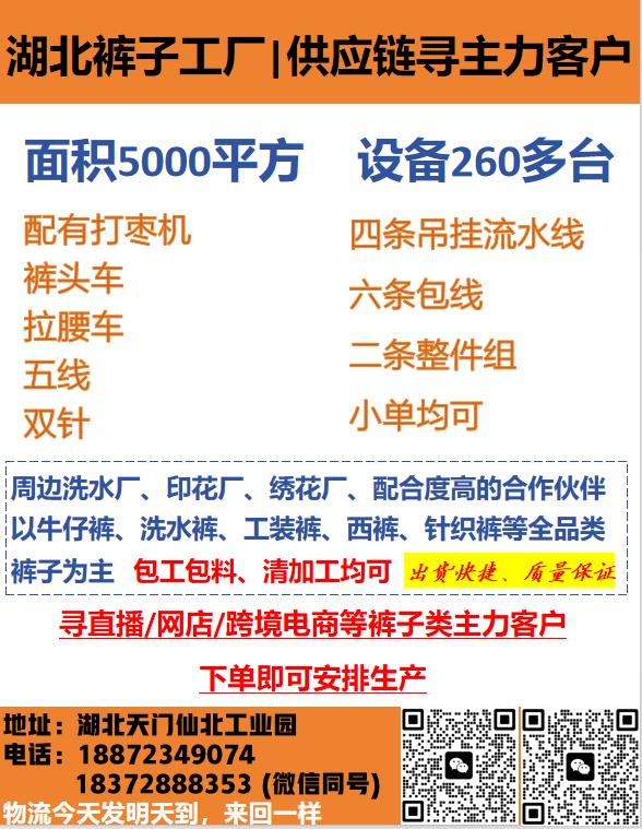湖北裤子工厂丨供应链寻主力客户职位:工厂/湖北/裤子
