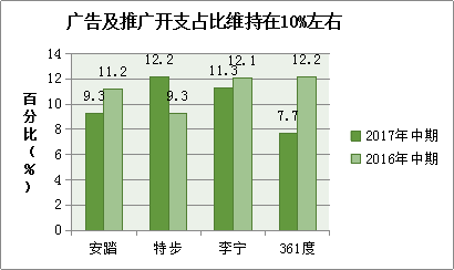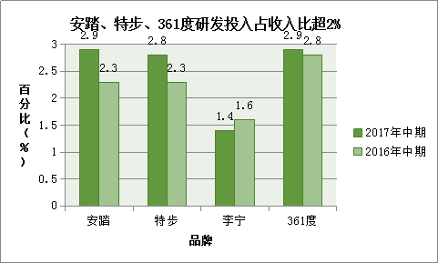 与此相对应的是,以特步为代表的国产运动品牌在产品研发上的投入。2017年中报显示,安踏的研发经费所占收益比例从去年的2.3%升至2.9%,特步紧随其后从2.3%增至2.8%,而361度则微升至2.9%。