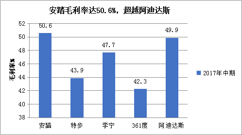 也正是利润率较高的专业体育产品,给各品牌带来了丰厚的毛利水平。2017年中报显示,安踏的毛利率达到50.6%,成功超越国外体育品牌巨头阿迪达斯。李宁、特步的毛利率也高达43%以上。