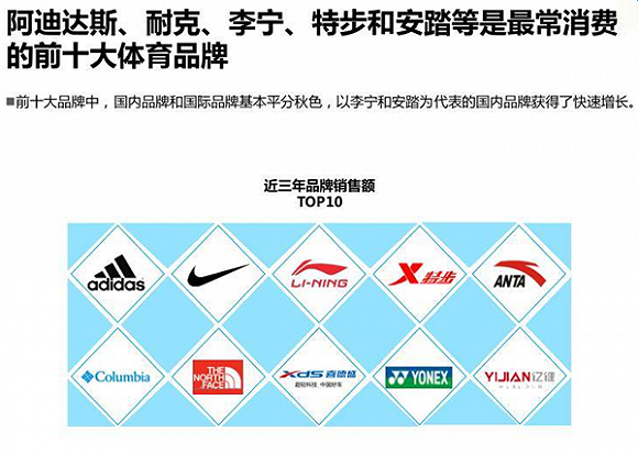 专业化的策略下,国产运动品牌的市场占有率也不断提升。京东体育发布的《2017互联网体育消费报告》显示,李宁、特步、安踏的销售额成功入围前五,与阿迪达斯、耐克并列国内互联网消费的前五大体育品牌。分类项目中,特步、安踏、李宁入围最受欢迎运动鞋包品牌前五;最受欢迎运动服饰品牌前五中,也有李宁和安踏的身影。
