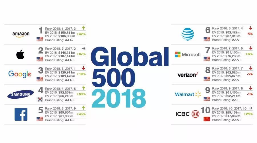 亚马逊的品牌价值过去一年增长42%,达到1508亿美元。苹果与谷歌分列第二和第三,品牌价值分别为1463亿美元和1209亿美元,与2017年相比分别增长37%和10%。三星位列第四,在亚洲品牌中排名最高,达到922.89亿美元,较2017年增长39%。中国工商银行名列第10,品牌价值达到591.89亿美元,较2017年增长24%。